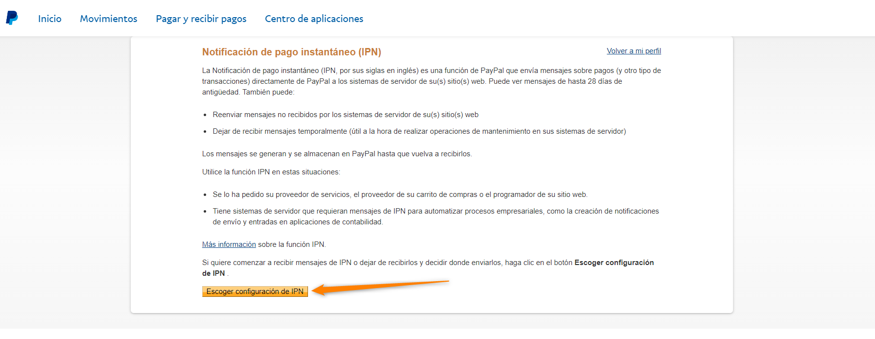 - Haga clic en el botón Elegir configuración de IPN para especificar la URL de su receptor y activarlo.