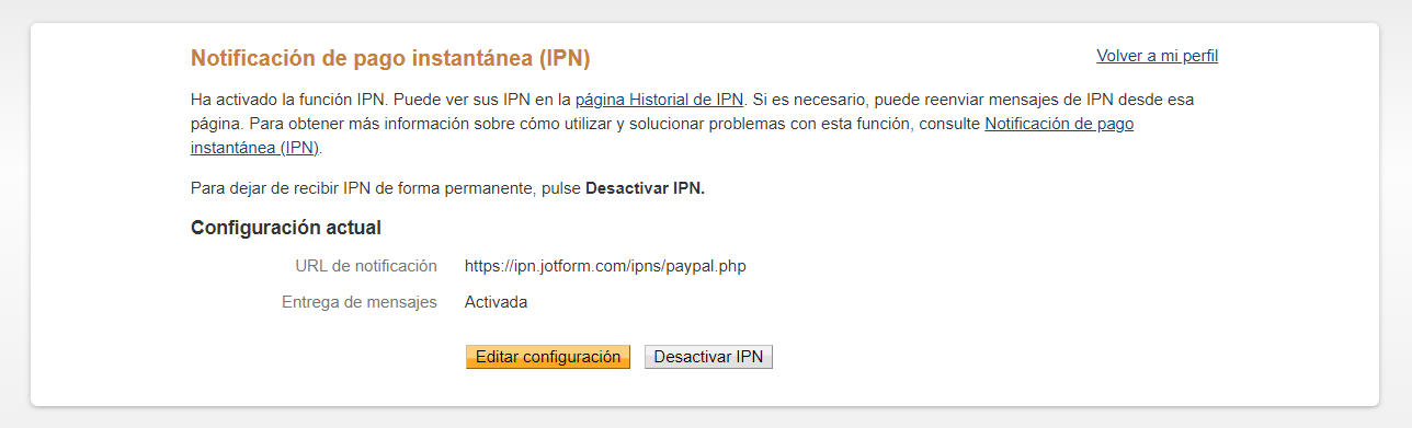 Nota: la URL de notificación predeterminada no importa. Jotform solo necesita que IPN esté habilitado.