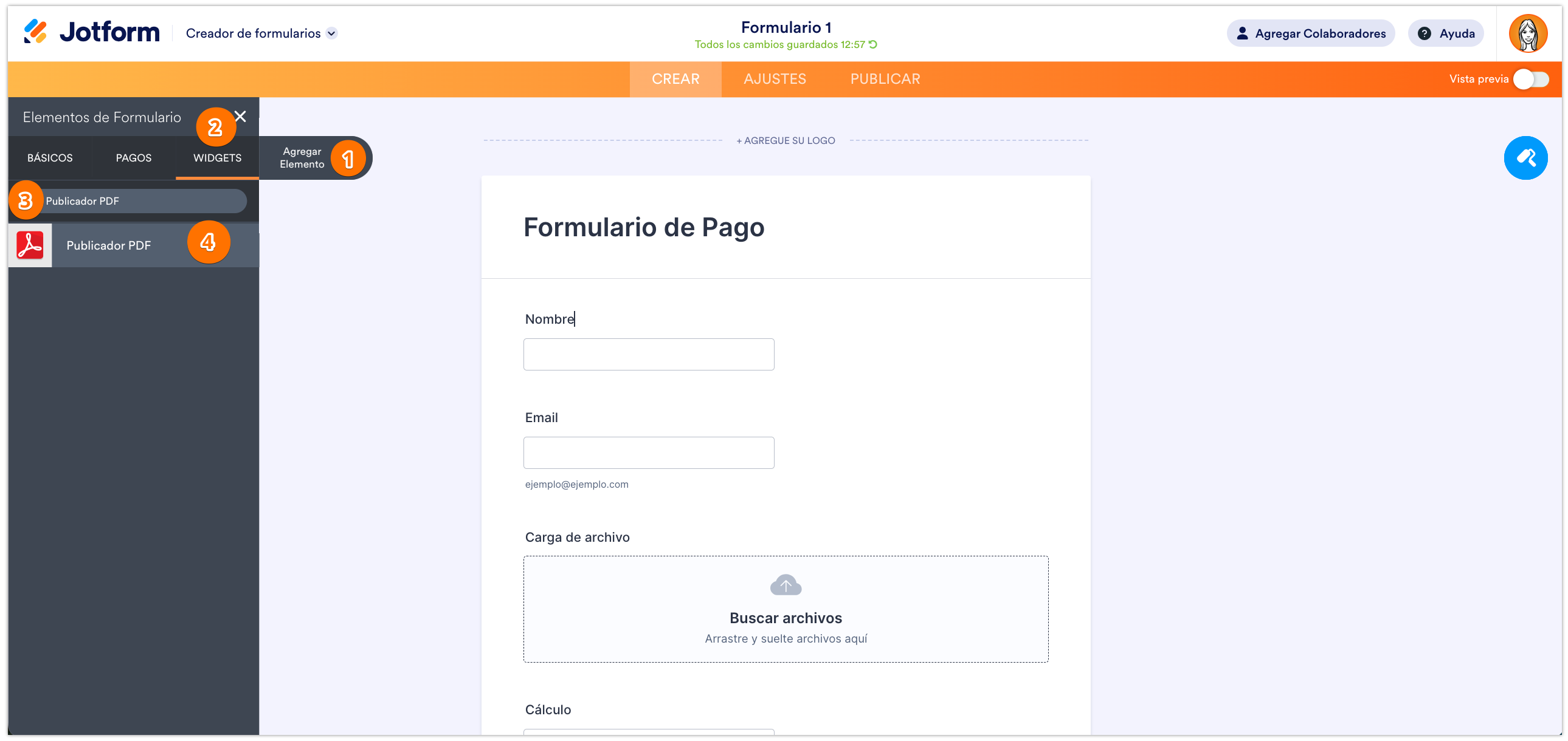 Hay dos maneras de mostrar un documento PDF dentro de un formulario. El primer método utiliza el widget de inserción de PDF para mostrar dicho archivo. El segundo método se basa en insertar el PDF directamente a través de un iframe utilizando el elemento Párrafo.