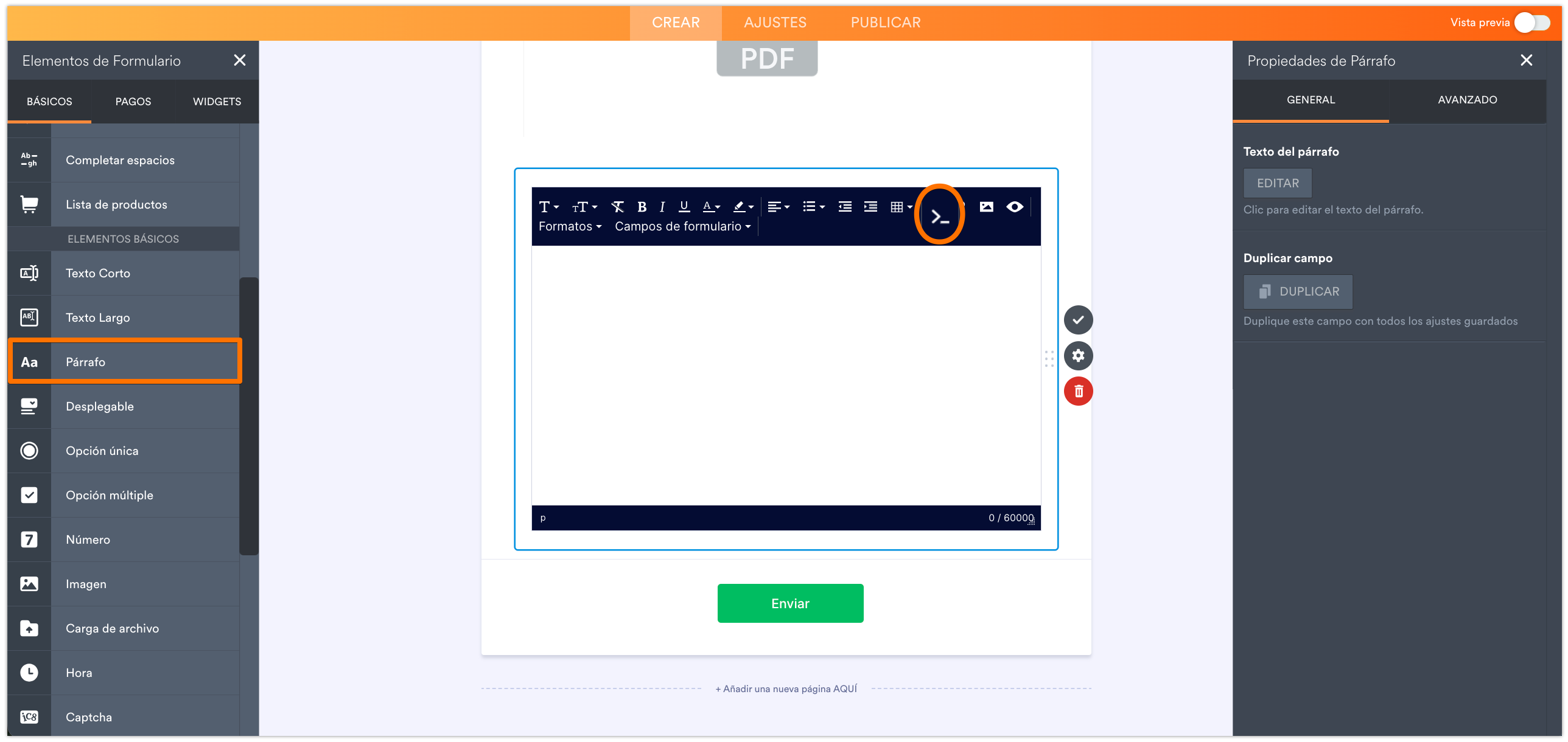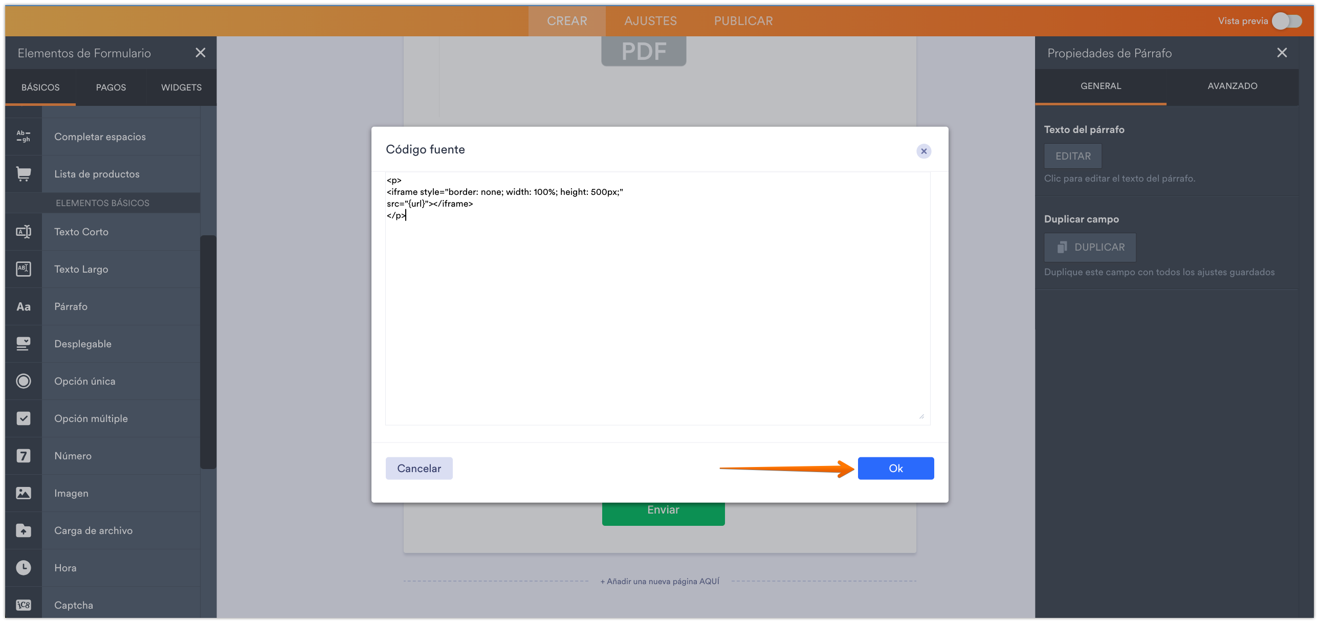 - En el Creador de formularios, agregad un elemento de Párrafo a vuestro formulario.