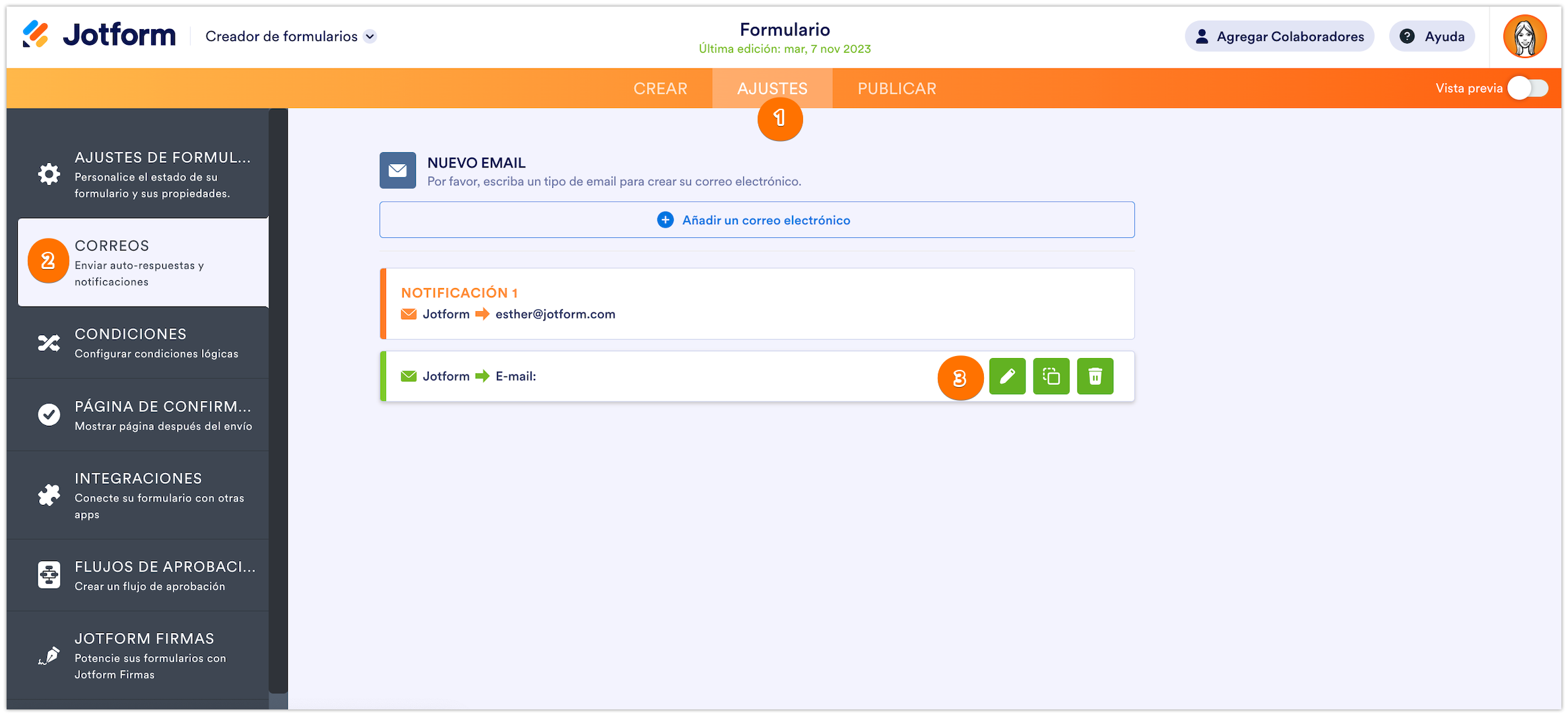- En el Creador de Formularios, id a Ajustes en la parte superior.