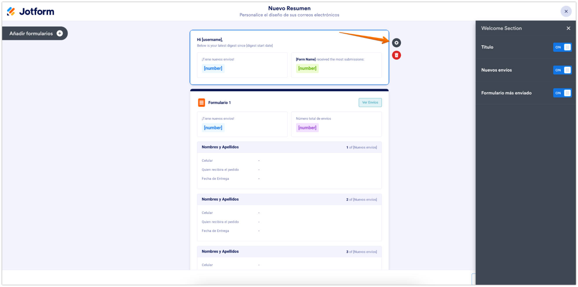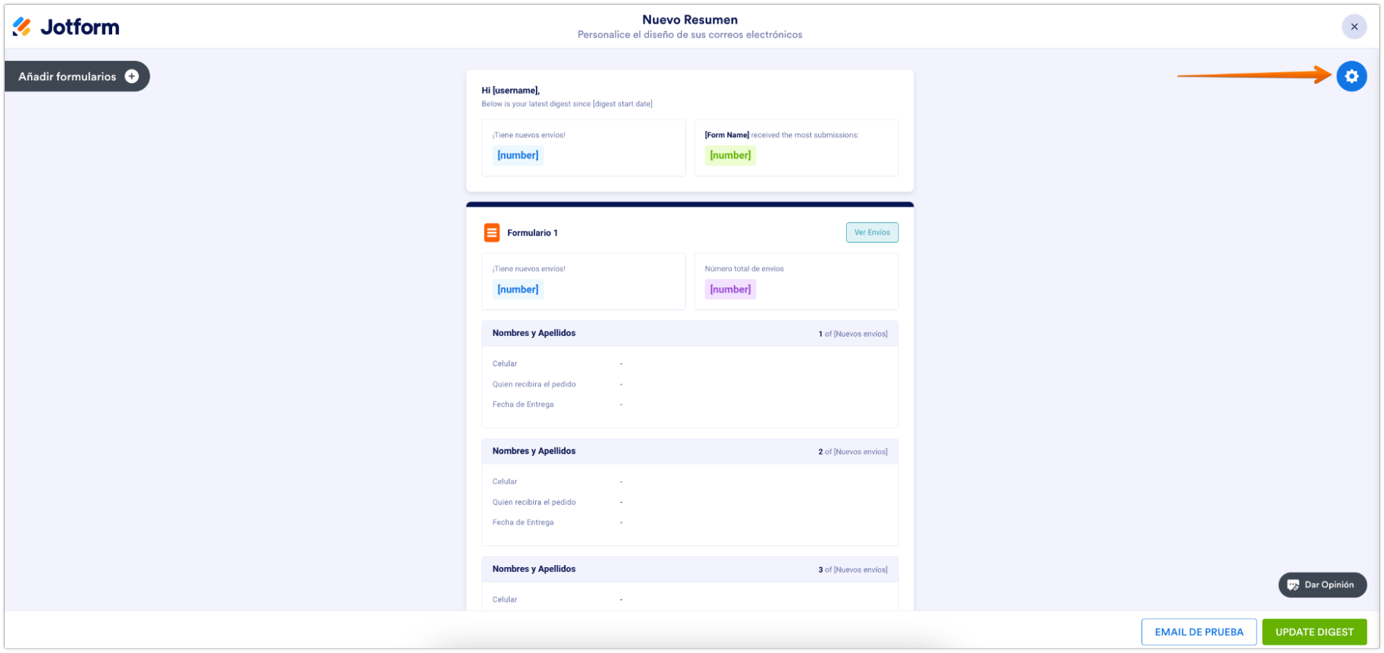 Clicad el icono de herramientas a la derecha para abrir los ajustes de los Emails Resumen. Los ajustes de los resúmenes de la derecha son mayoritariamente para personalizar los ajustes del mismo email, no necesariamente los elementos dentro del email.