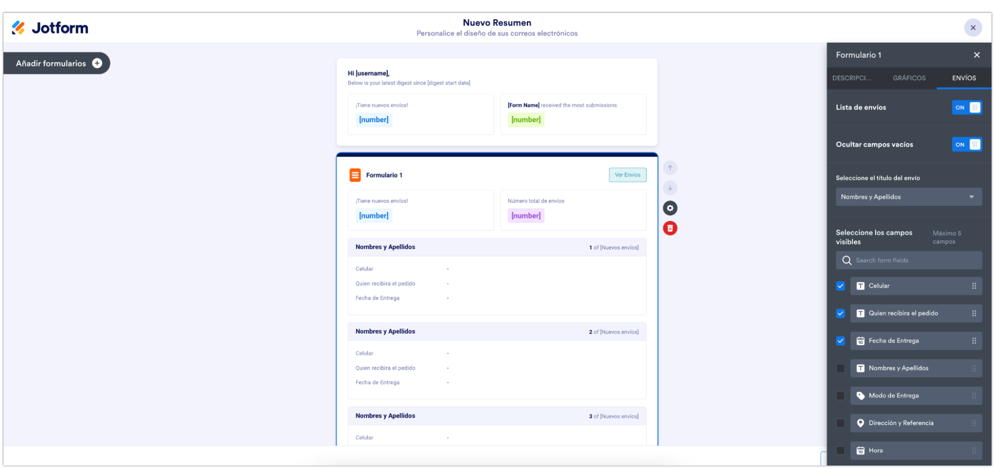 Podéis personalizar lo que queráis ver a partir de los datos que se os envían. Podéis escoger los campos visibles en los Emails Resumen y podéis escoger qué campos ocultar o lista de envíos.