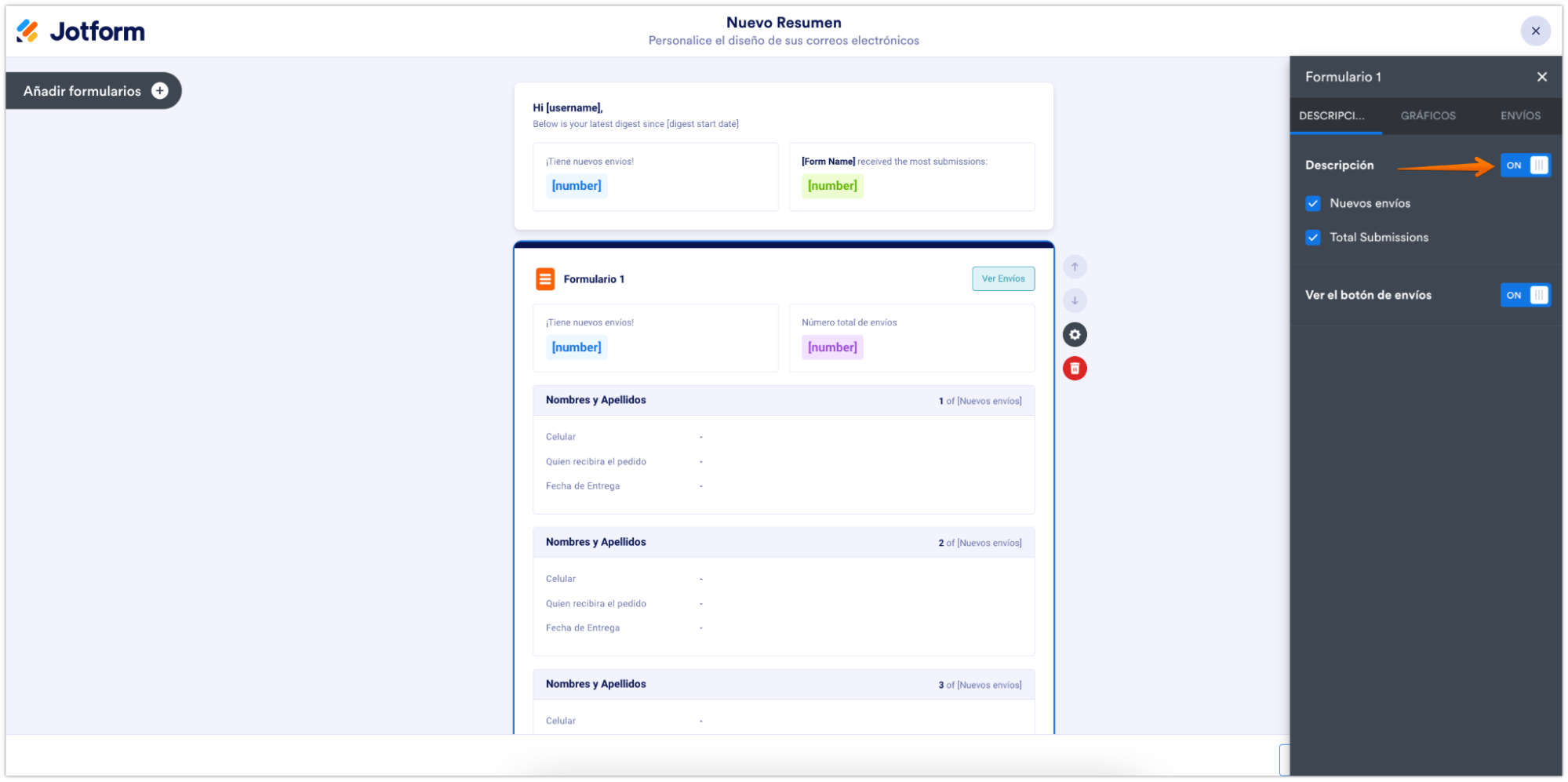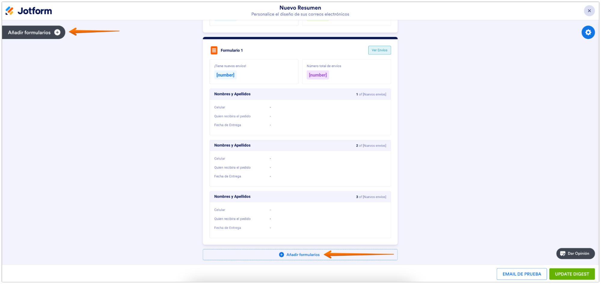 Si queréis añadir otros formularios a vuestros Emails Resumen, hay dos maneras de hacerlo, la primera es clicando en añadir botón al formulario a la izquierda del creador de resúmenes. El segundo, es bajar al botón de la página y clicar en Añadir Formulario con el botón.