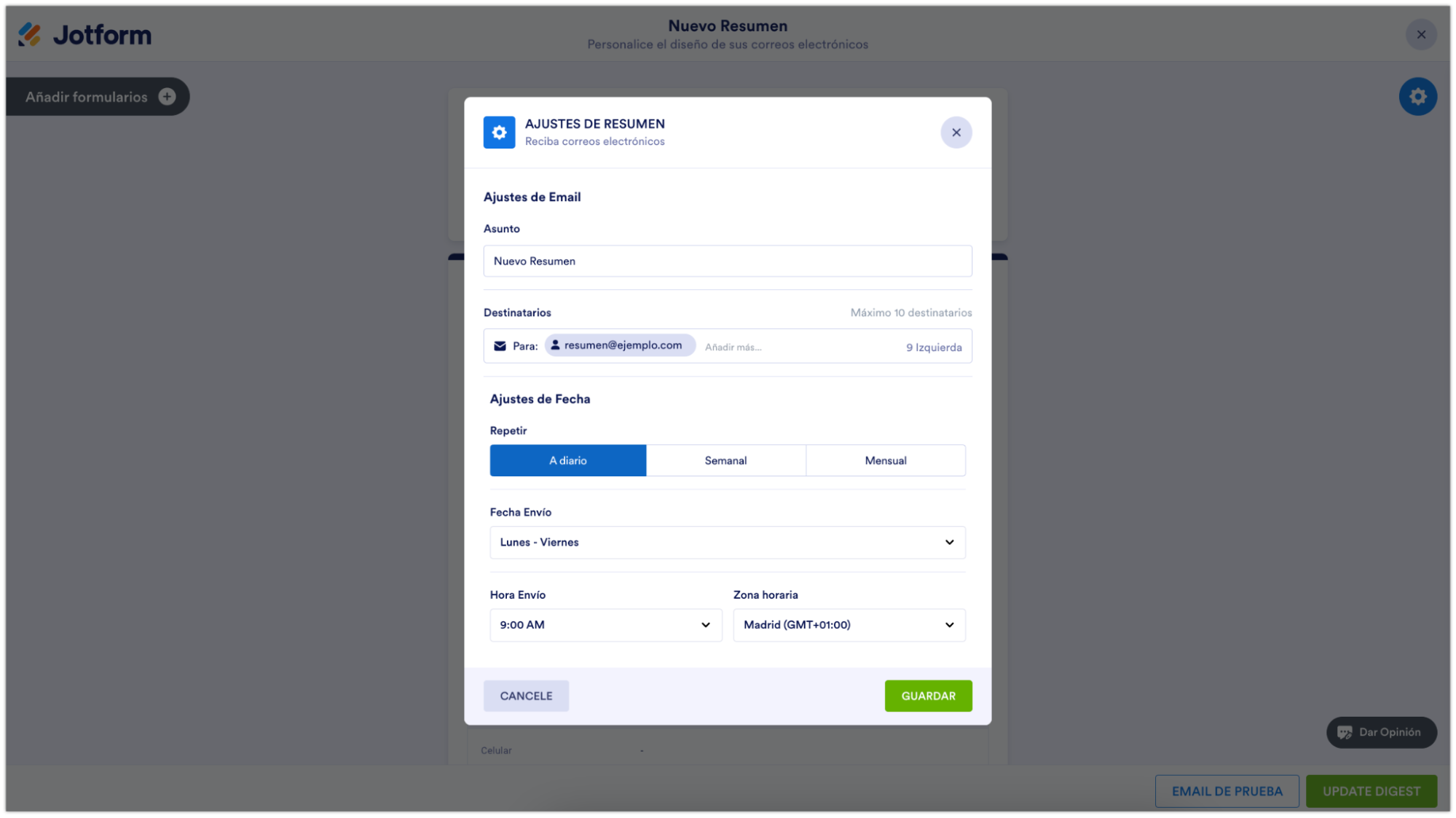 En los Ajustes de los Emails Resumen, podréis personalizar el sujeto, la fecha, y los ajustes de hora. Podréis incluso escoger quién recibe los emails resumen. Pero recordad, que solo podréis enviar los emails resumen hasta a diez personas, y si estáis en el plan Inicial únicamente lo podréis enviar a una persona.