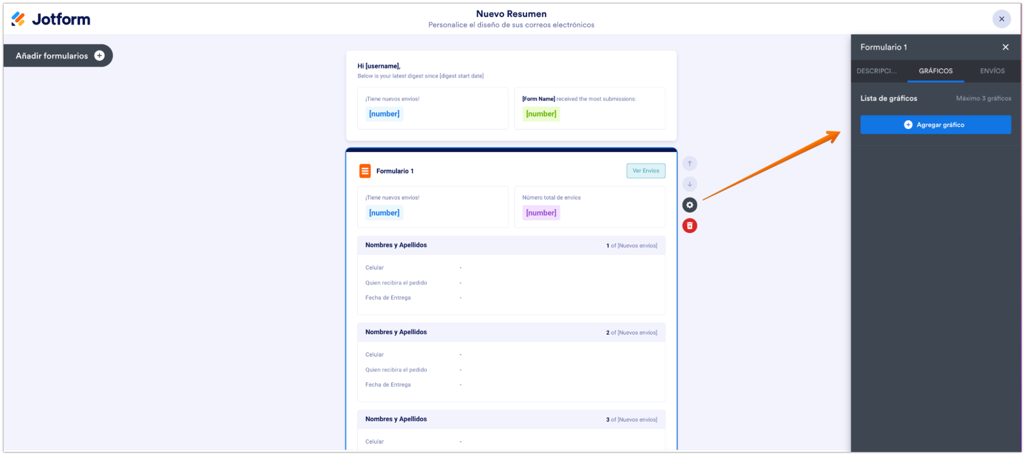 Para añadir un gráfico, únicamente clicad en el botón Añadir Gráfico. Clicad las preguntas en las listas de los gráficos para mayor personalización.
