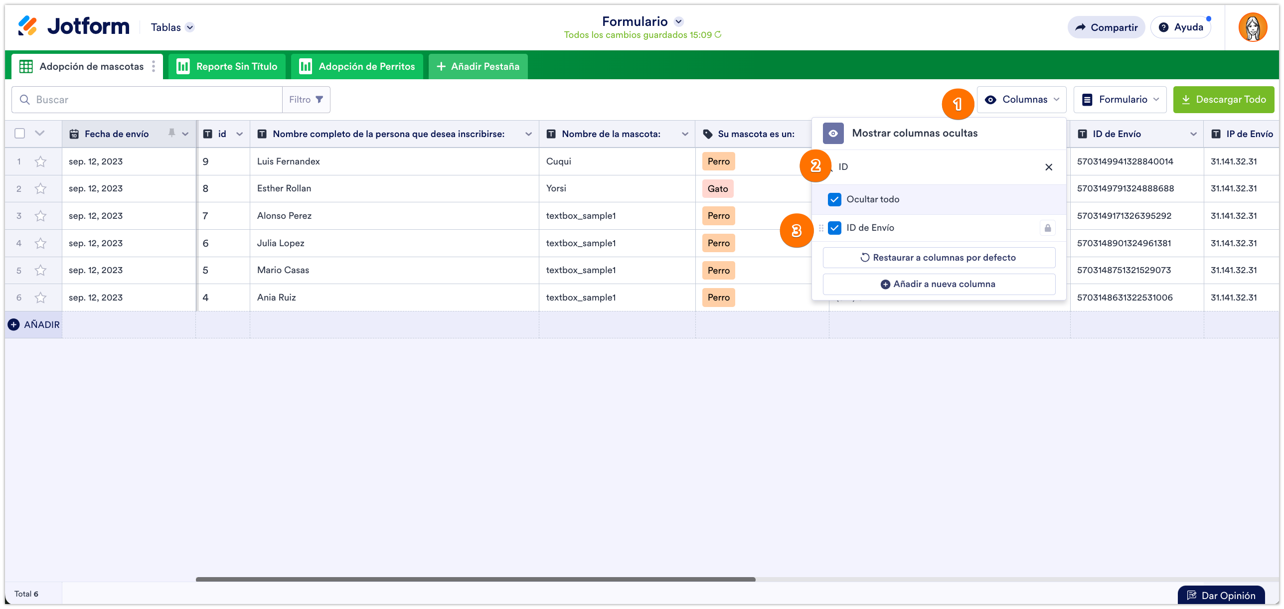 - Seleccionad Envíos en la parte superior para así abrir Jotform Tablas.