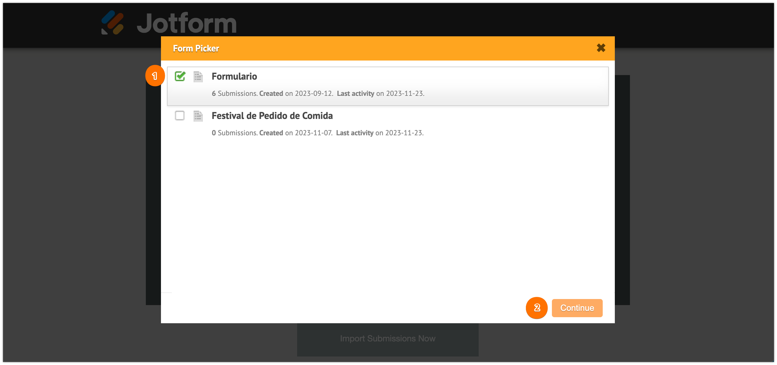 - En el Seleccionador de Formularios, escoge un formulario, y después, seleccione Continuar.