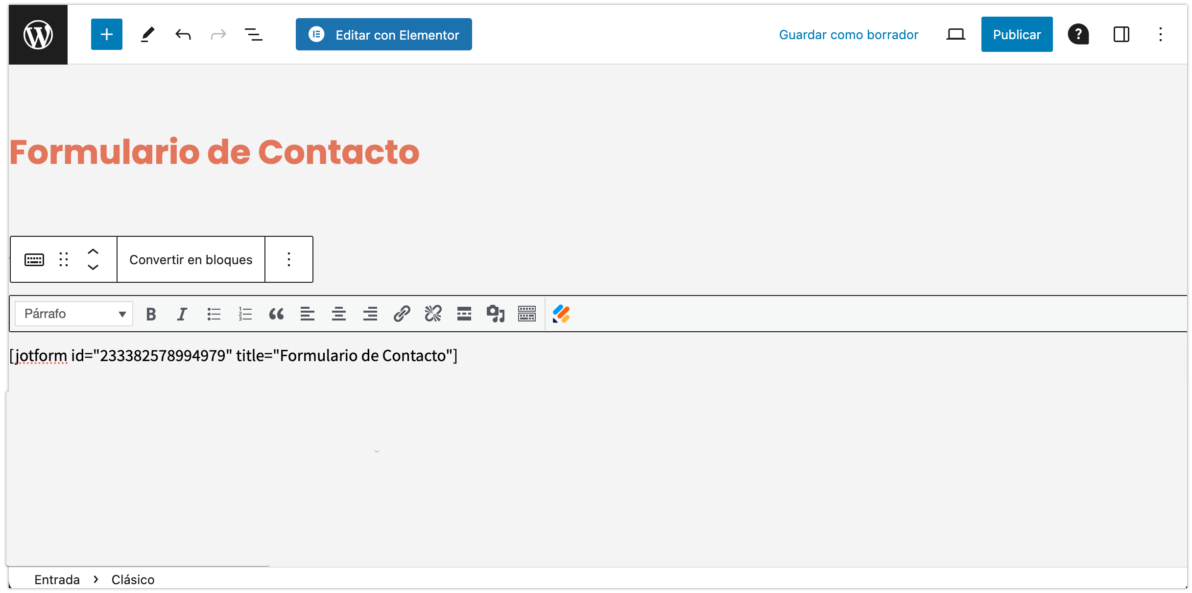 - Si está utilizando el editor Gutenberg, tendrá que añadir el bloc Clásico para ver el icono de Jotform.