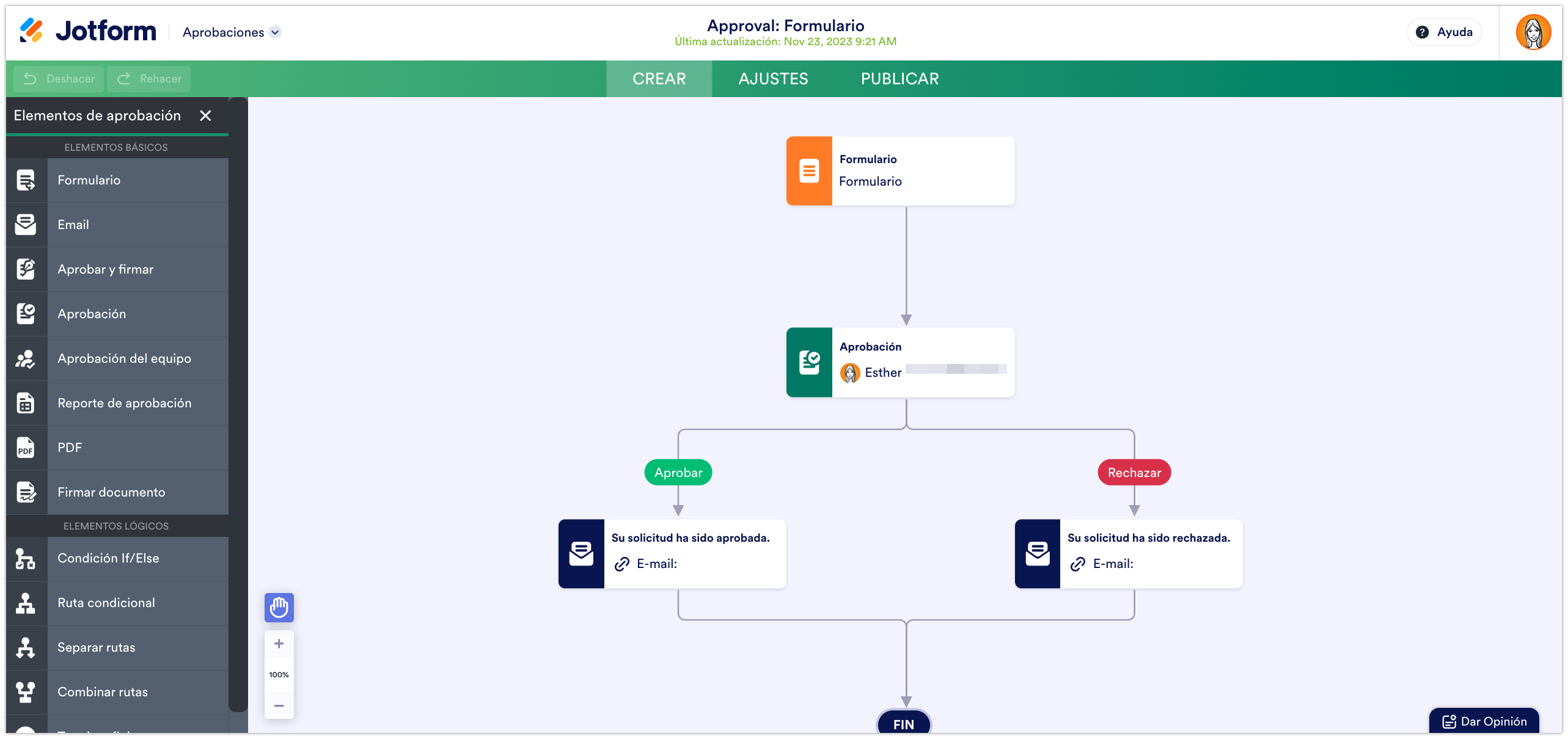 Esto abrirá el creador de Aprobaciones de Jotform con un flujo de aprobaciones básico.
