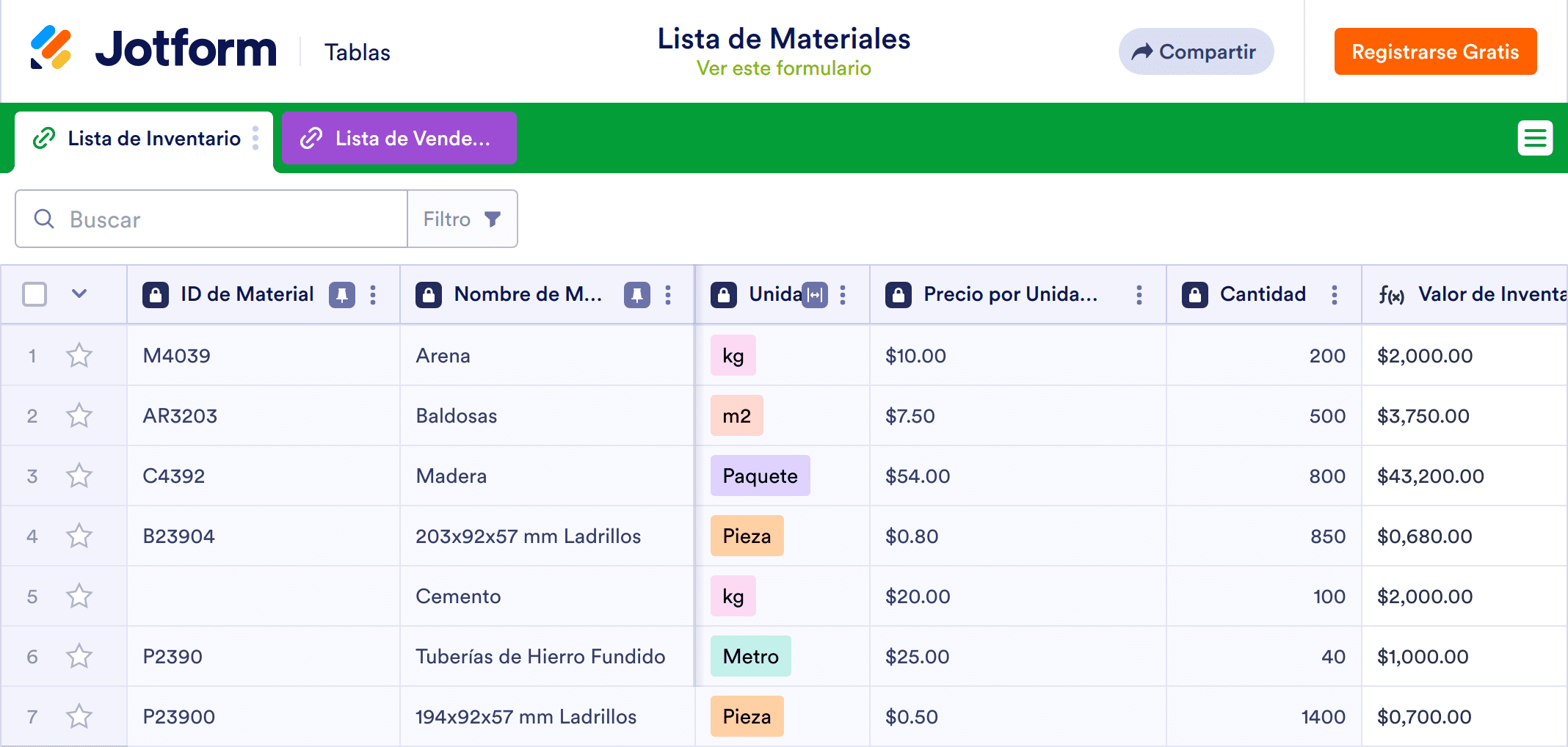 Una Lista de Materiales es una hoja de cálculo en línea que se utiliza para almacenar información sobre materiales. Asegúrate de tener todo lo que necesitas para tu próximo gran proyecto con esta plantilla gratuita de Lista de Materiales. Introduzca los materiales manualmente o rellene automáticamente la hoja de cálculo vinculándola a un formulario en línea fácil de rellenar. Podrás después controlar datos como los artículos en stock, los precios unitarios, la información sobre proveedores y mucho más. Incluso puedes descargar la hoja de cálculo en formato CSV, Excel o PDF — perfecto para guardarla o compartirla sin conexión.