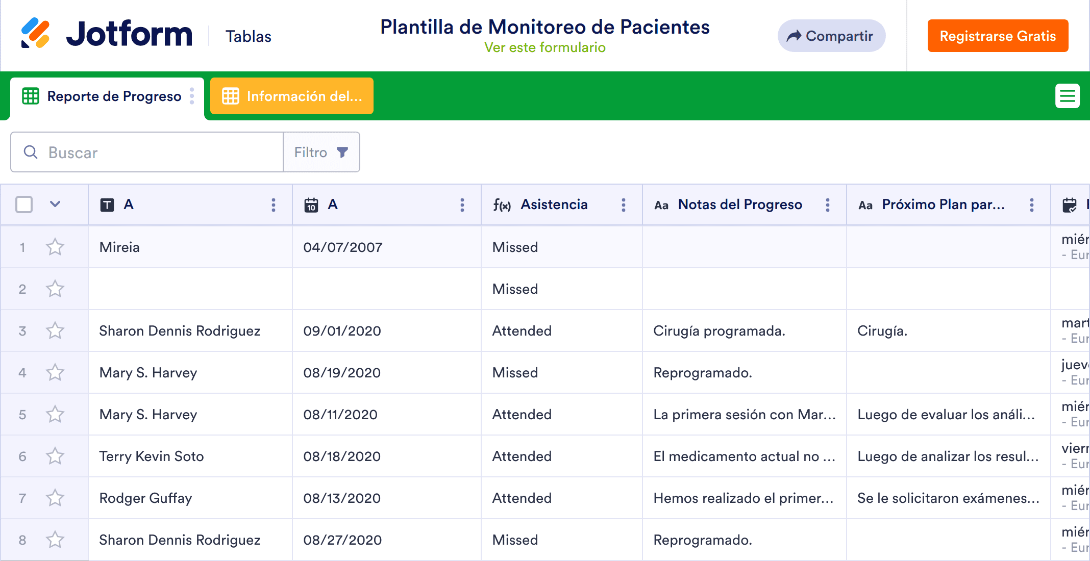 Una plantilla de monitoreo de pacientes es un registro médico utilizado por los doctores para monitorear el estado del paciente a medida que reciben el tratamiento. Ya sea que usted sea un médico de primera línea, fisioterapeuta, psiquiatra o médico especialista, nuestro Monitoreo de Pacientes le ayudará a tener un mejor control de la salud de sus pacientes. Para comenzar, simplemente ingrese la información del paciente y los detalles de la consulta — tales como nombre, fecha del tratamiento, asistencia y notas progreso — en la base de datos del paciente. Usted será capaz de visualizar y acceder a la Plantilla de Monitoreo de Pacientes desde cualquier computadora o dispositivo móvil e incluso puede compartir está información con pacientes y otro personal médico con un solo click.