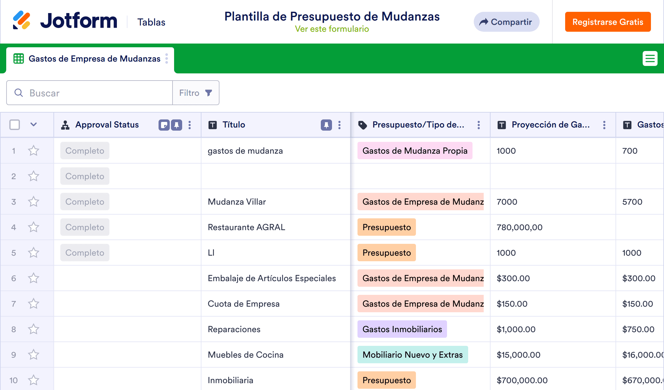 ¡Muévete con nuestra nueva Plantilla de Presupuesto de Mudanzas gratuita en línea! Sin importar a donde se esté mudando, debe asegurarse de no salirse del presupuesto. Lleve un registro de los gastos de mudanza con esta Plantilla de Presupuesto de Mudanzas fácil de usar, que puede ser llenada desde cualquier ordenador o dispositivo móvil. Simplemente introduzca la información a mano, o rellene el formulario adjunto para sincronizar las respuestas con la tabla.