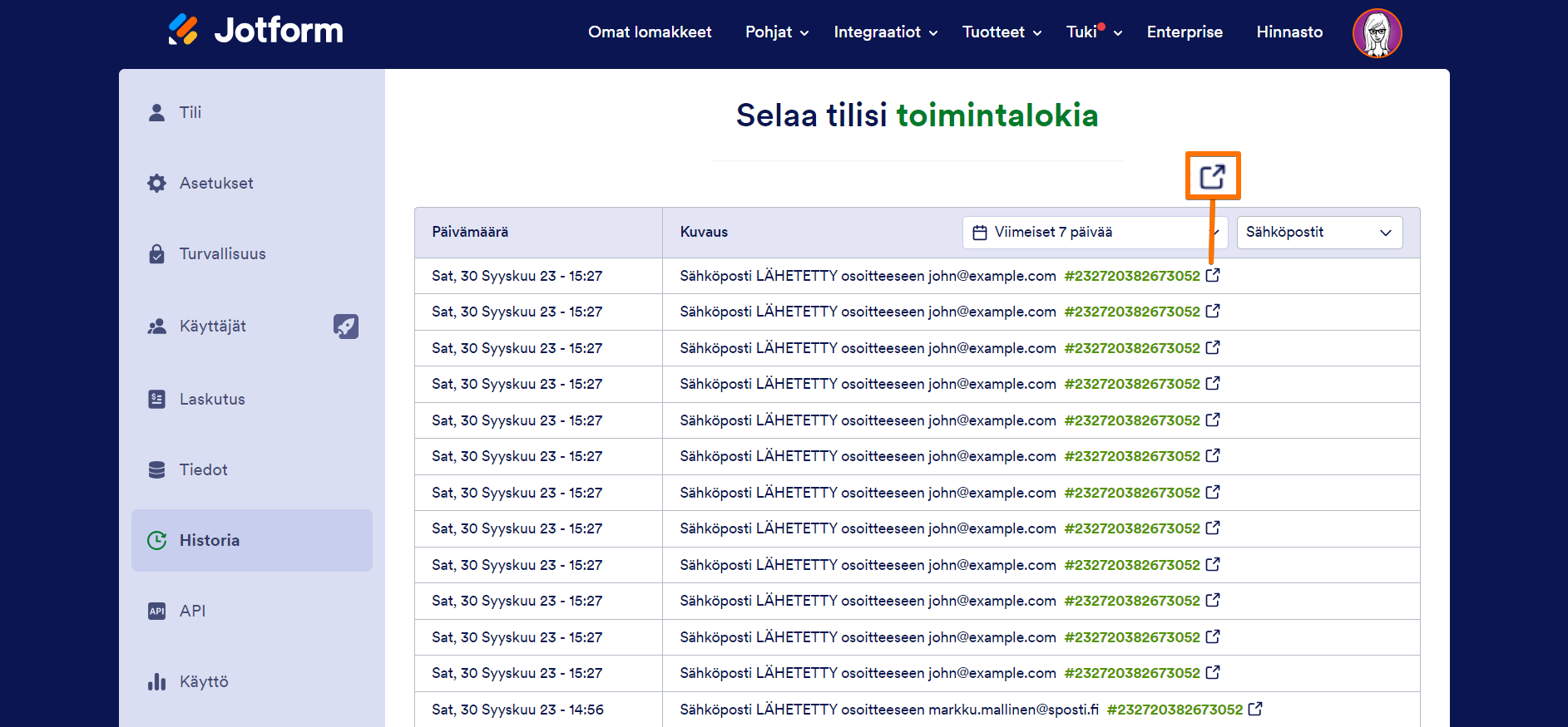 Taulukossa pitäisi nyt näkyä lomakkeiden sähköpostilokit aikaleimoineen, tila, vastaanottajat ja lomaketunnukset. Voit tarkastella lokitietoja tietoja tarkemmin valitsemalla uuden ikkunan kuvakkeen.