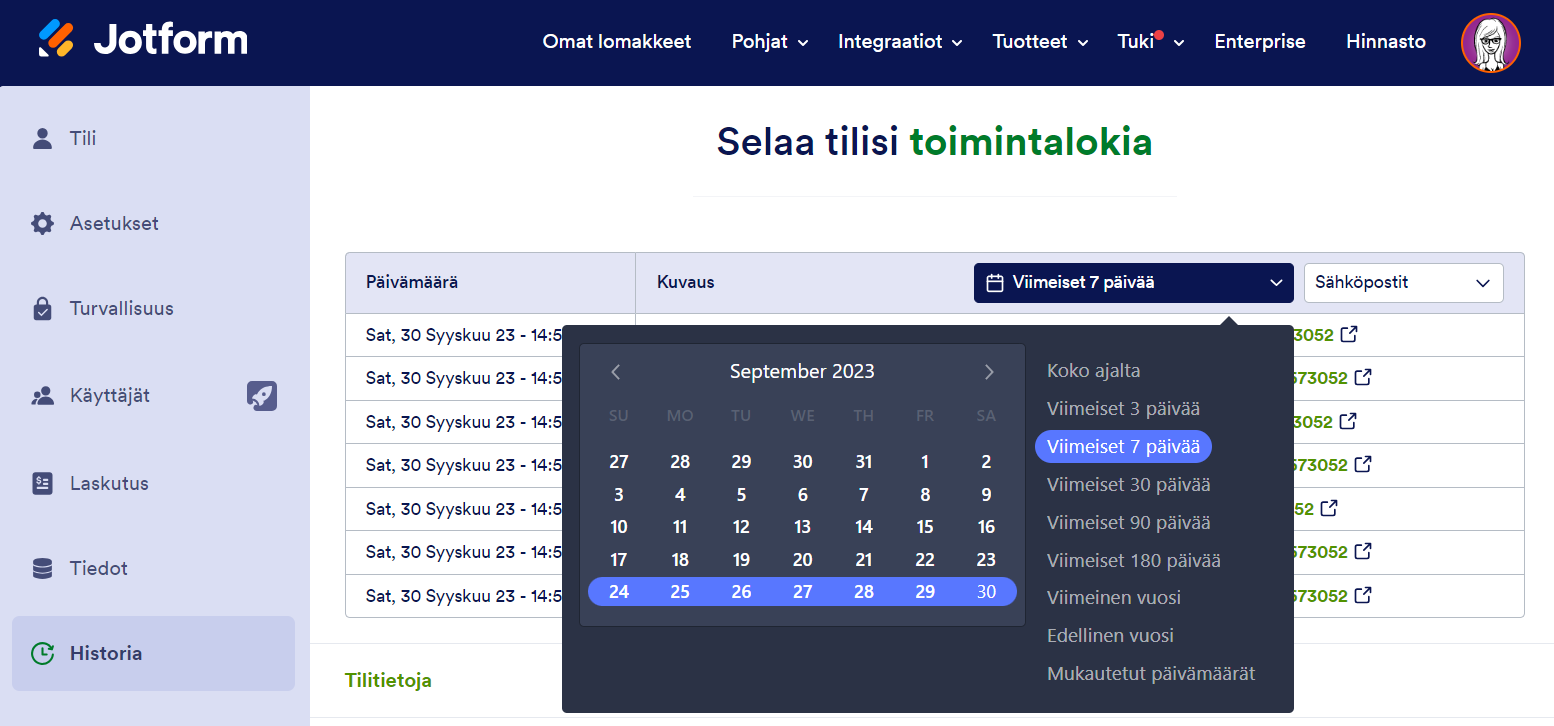 - Avaa päivämääräsuodatin taulukon oikeasta yläkulmasta ja valitse haluamasi ajanjakso päivämäärävalitsimesta.