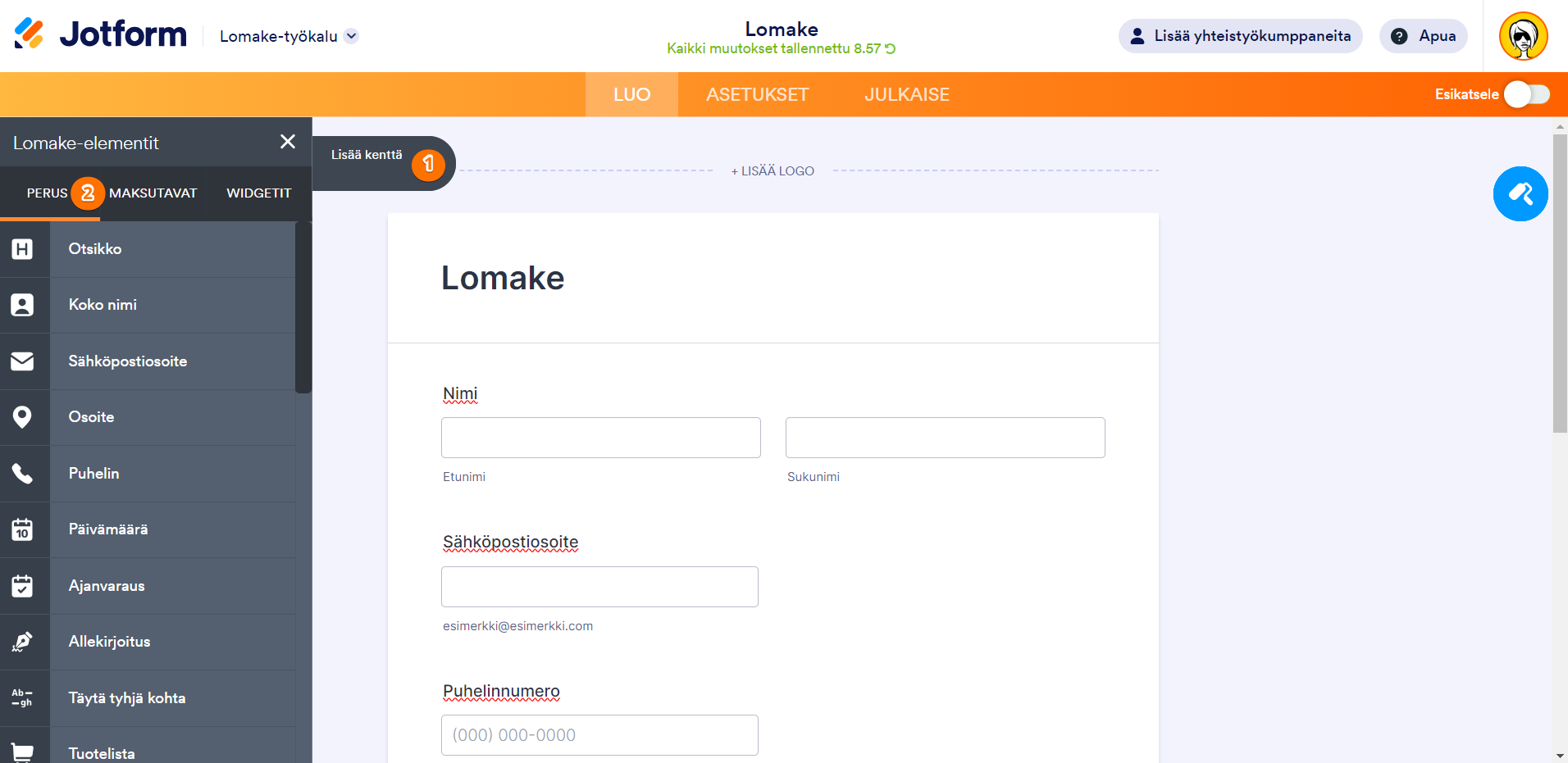 Kysymällä käyttäjien yhteystiedot, kuten nimi ja sähköpostiosoite, voit helpommin hallinnoida lomakevastauksia ja pitää käyttäjiin yhteyttä myöhemmin jos siihen on tarve. Klikkaa Lomakerakentajassa Lisää kenttä -painiketta vasemmalla, ja auenneesta valikosta voit raahata erityyppisiä kenttiä lomakkeelle. Tavalliset kenttätyypit löydät Perus -elementeistä.
