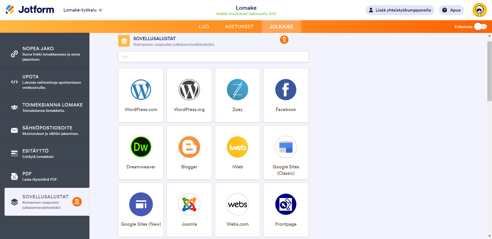 Lomakkeille on myös omat upotustapansa monille kotisivurakentajille ja CMS-alustoille. Jos käytät tällaista alustaa, avaa vasemmanpuoleisesta valikosta Sovellusalustat: