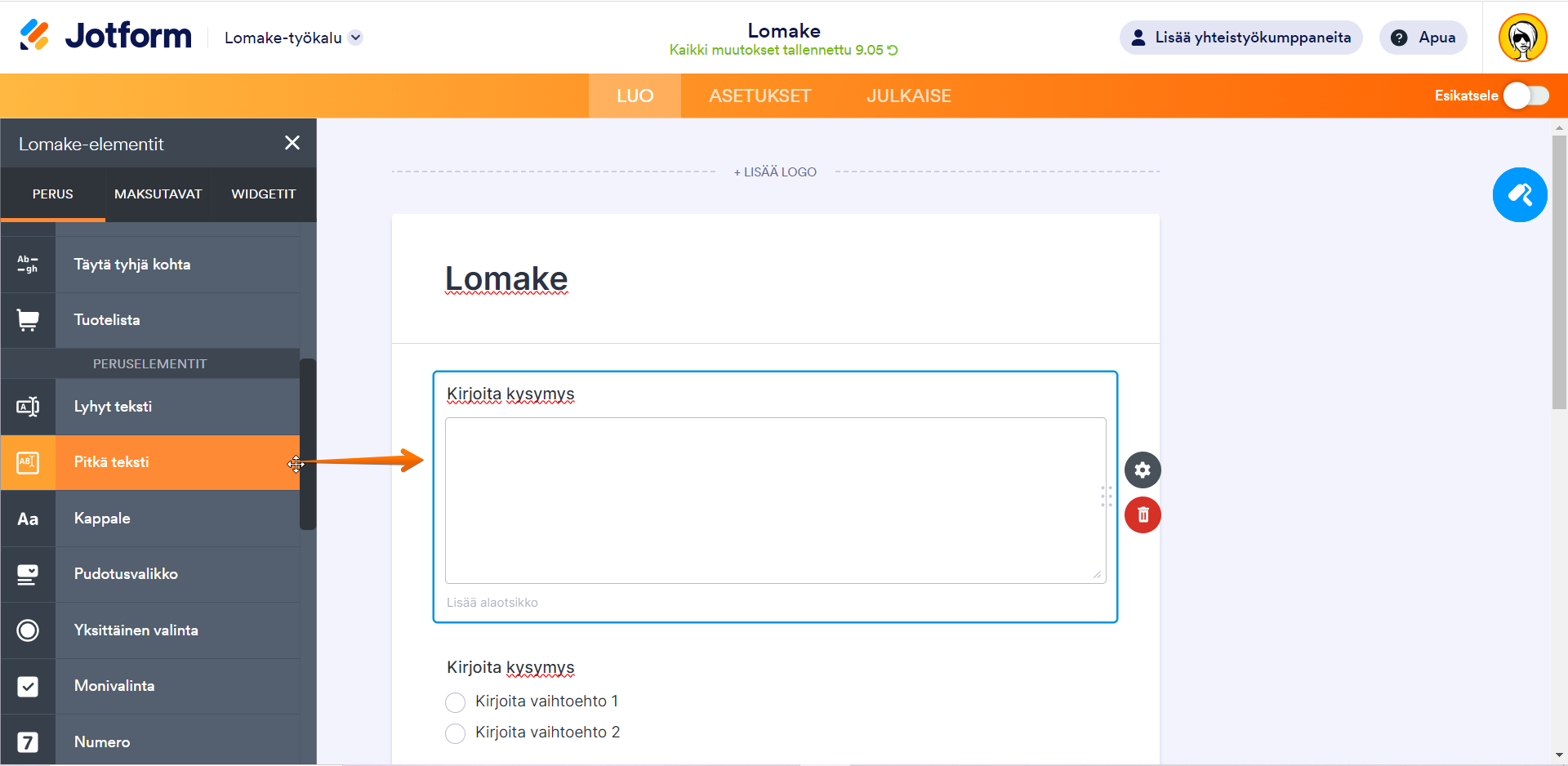 Isompi kommenttikenttä antaa käyttäjillesi vaihtoehdon kirjoittaa pidemmän, vapaamuotoisen tekstivastauksen. Tämä on hyvä ratkaisu esimerkiksi kommenteille, kuvauksille, ja vapaille mielipiteille. Löydät kentän PERUS -elementtien alta.