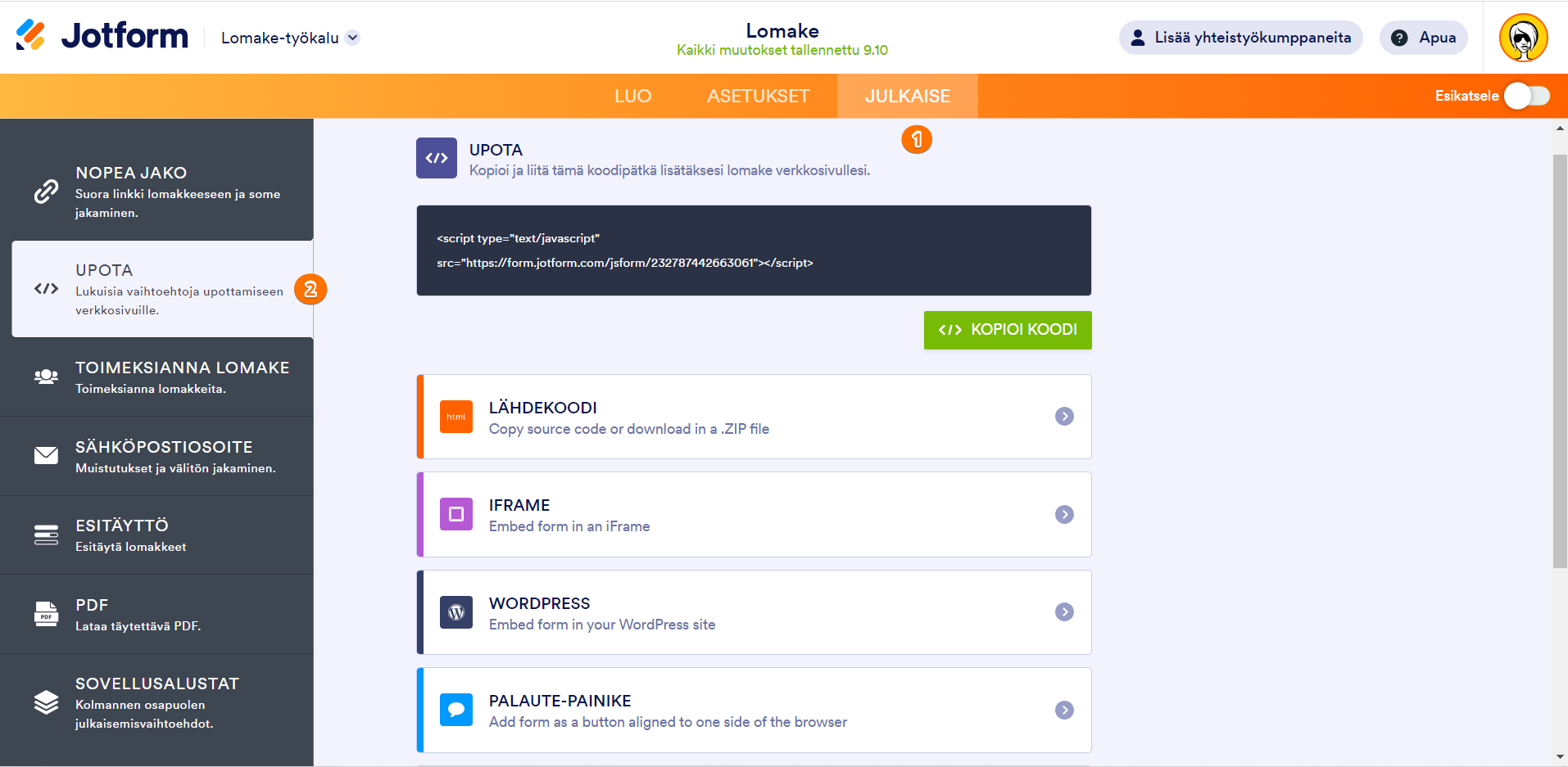 Kopioi ja liitä upotuskoodi ja liitä se kotisivujesi lähdekoodiin, yleensä body-osion sisälle. Lomakkeesi näkyy kotisivuillasi heti, kun tallennat muutokset koodiin.