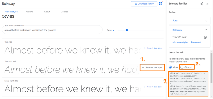 Vaihda Raleway haluamaksesi Google fontiksi. Löydät fonttisi nimen Google Fonttien sivulta, josta kopioit koodin.