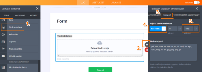 Toisinaan on hyödyllistä rajata minkä kokoisia tiedostoja käyttäjät voivat lähettää lomakkeilla, etenkin Dropbox ja Google Drive -integraatioita käyttäessä.