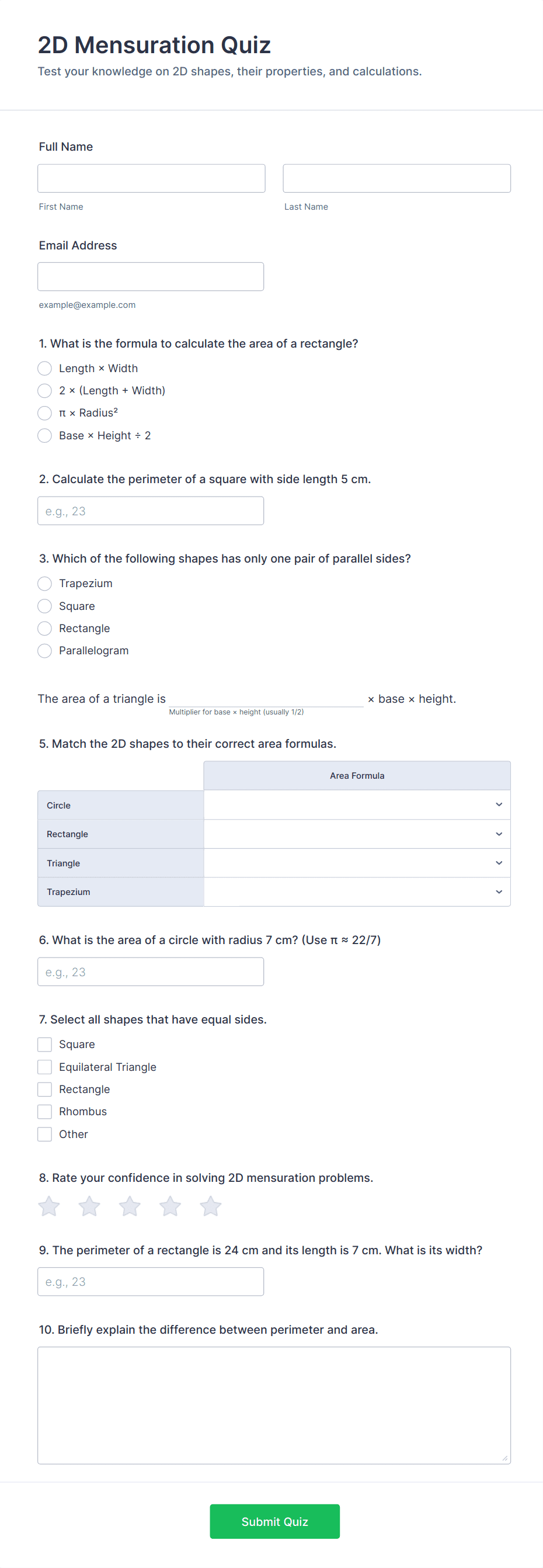 Quiz Templates are pre-designed forms specifically created to facilitate the process of building quizzes for a variety of purposes, such as education, employee training, lead generation, event engagement, and more. These templates provide a structured way to present questions, collect answers, and automatically score or evaluate responses. Whether you’re a teacher assessing student knowledge, a business running a product knowledge test, or a marketer creating a fun personality quiz, Quiz Templates offer a flexible foundation to suit your needs. They can be used for online exams, trivia games, onboarding assessments, customer feedback quizzes, and interactive learning modules.