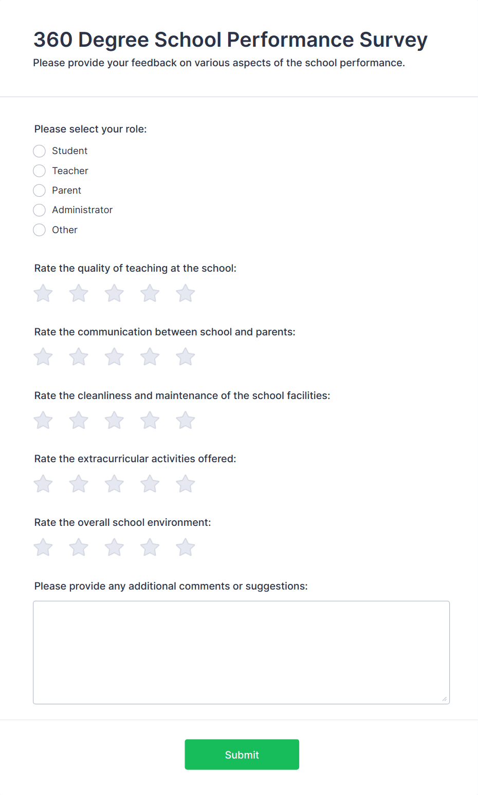 - For student or parent surveys, add questions about satisfaction, communication, and support services.