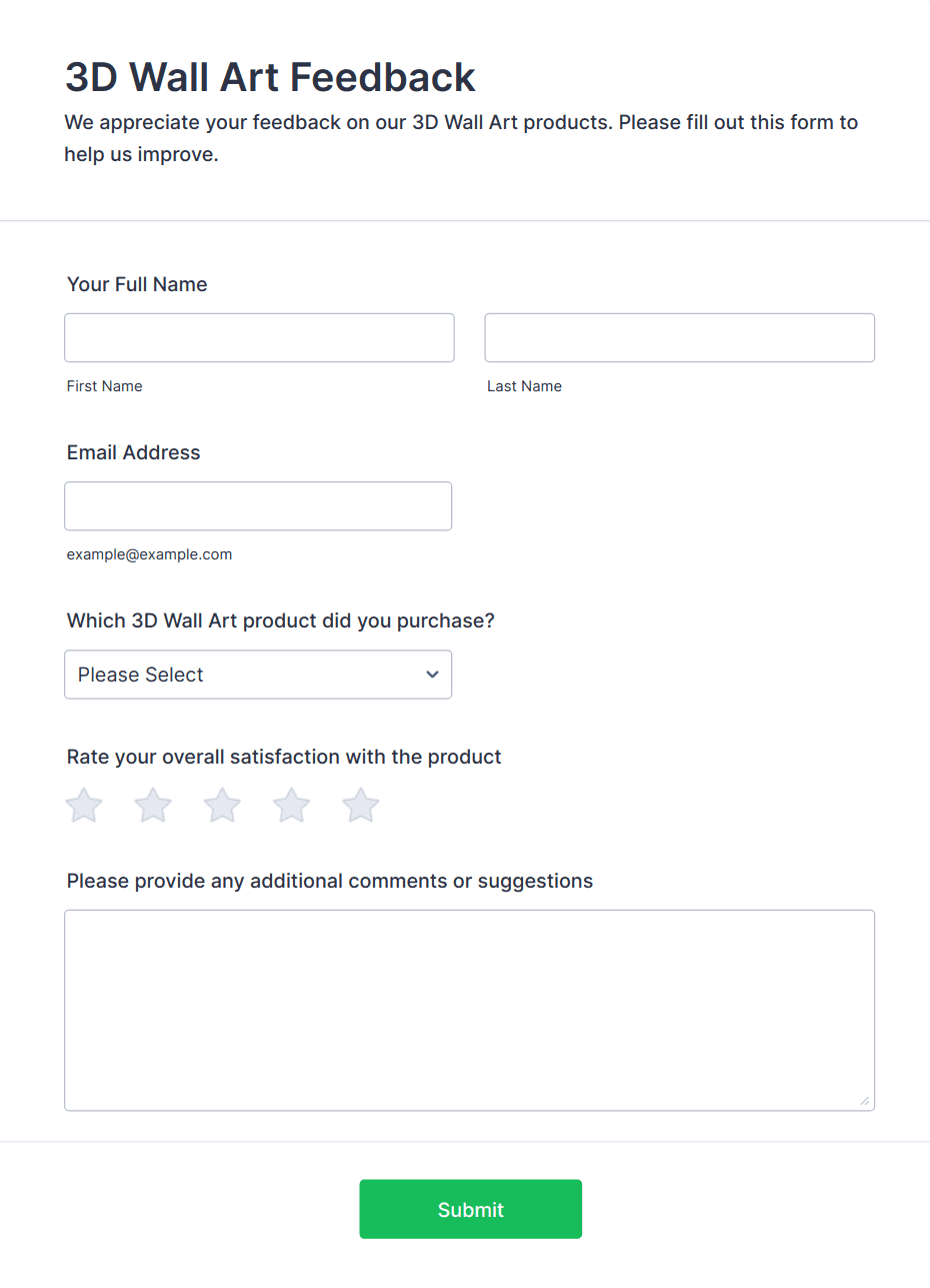 • Product feedback forms may include questions about usability, features, and likelihood to recommend.
