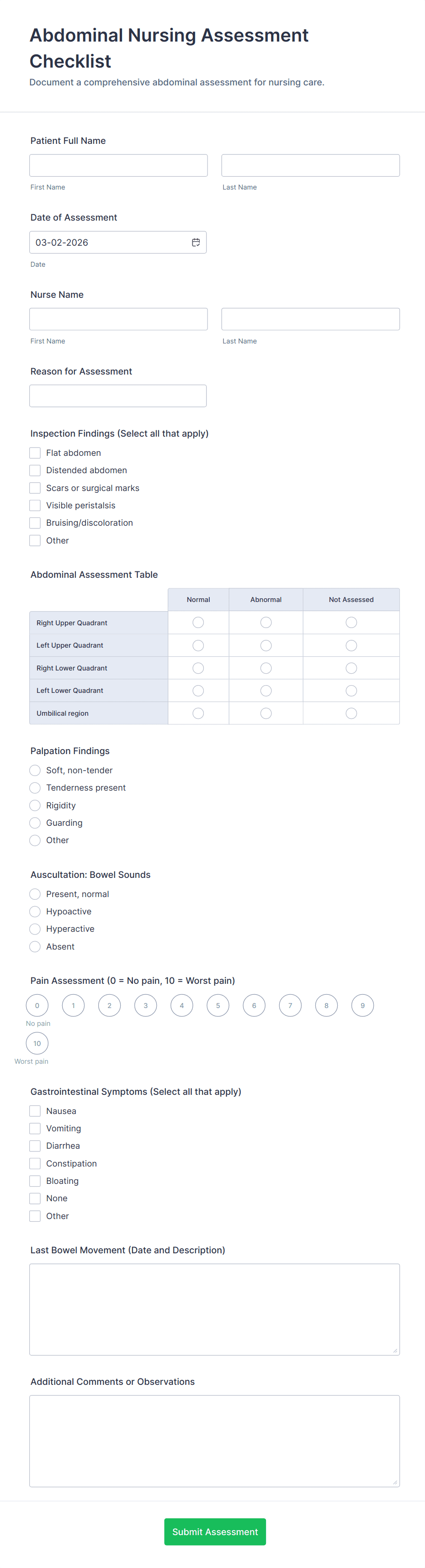 Add fields for symptoms, medical history, medications, allergies, lifestyle factors, and functional status depending on the assessment type. Use rating scales for severity and impact.