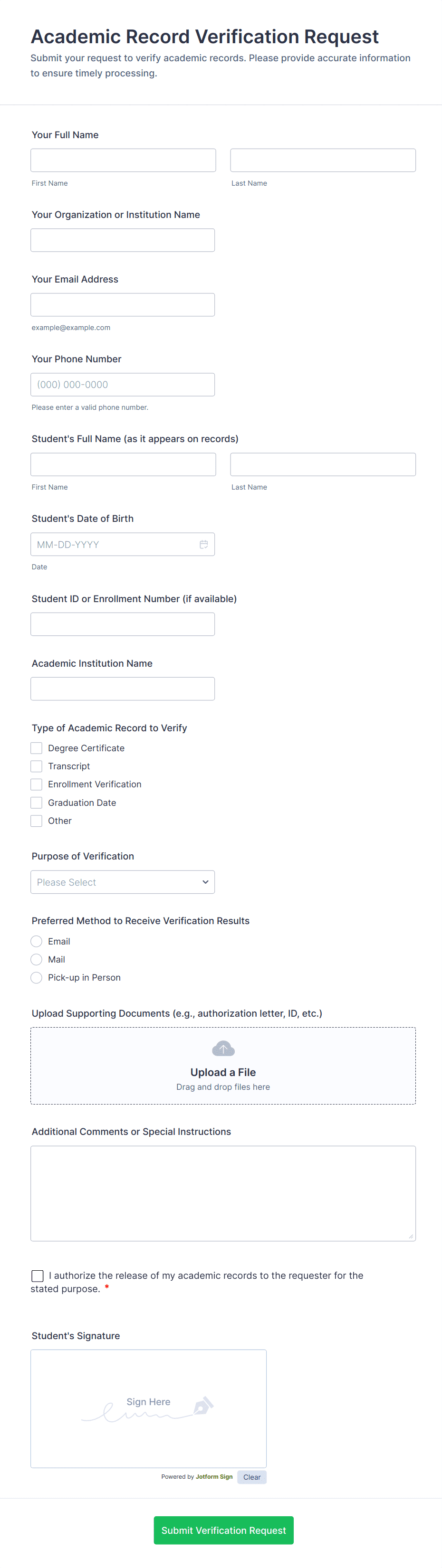 By following these steps, you can create a robust verification form that streamlines your workflow, reduces manual effort, and ensures data accuracy. Jotform’s flexible features make it easy to adapt your form to any verification scenario, providing a seamless experience for both you and your users.
