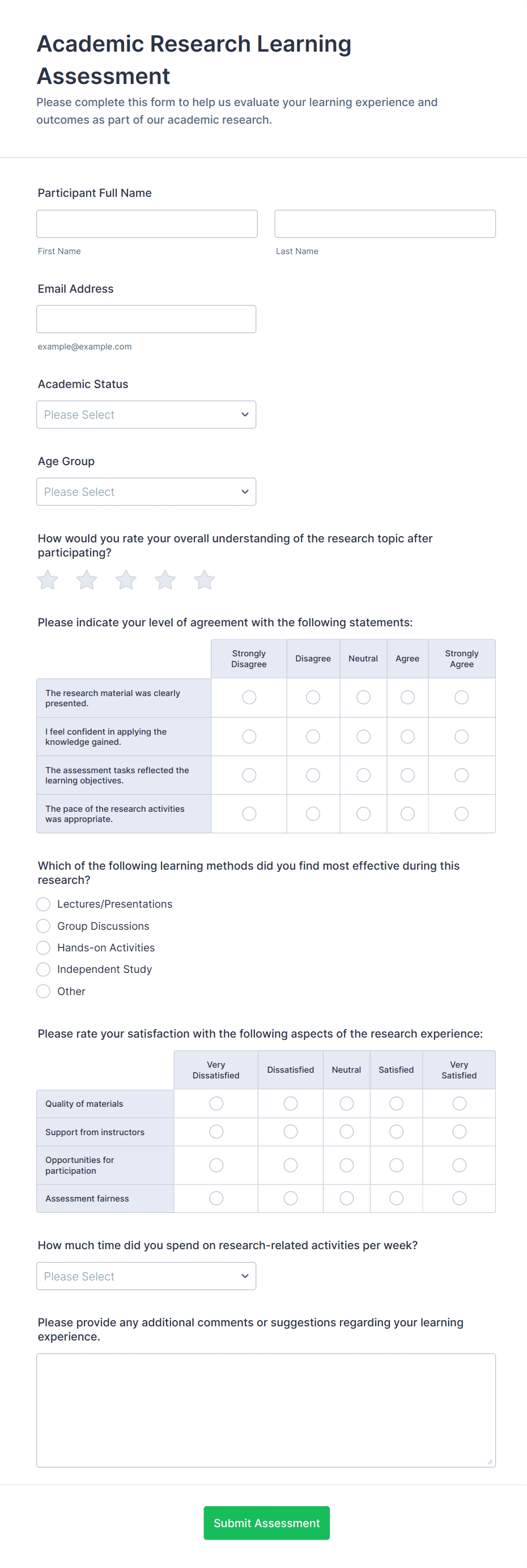 Assessment forms may include personal details, multiple-choice or open-ended questions, rating scales, comment sections, and sometimes automated scoring or feedback fields, depending on the purpose.