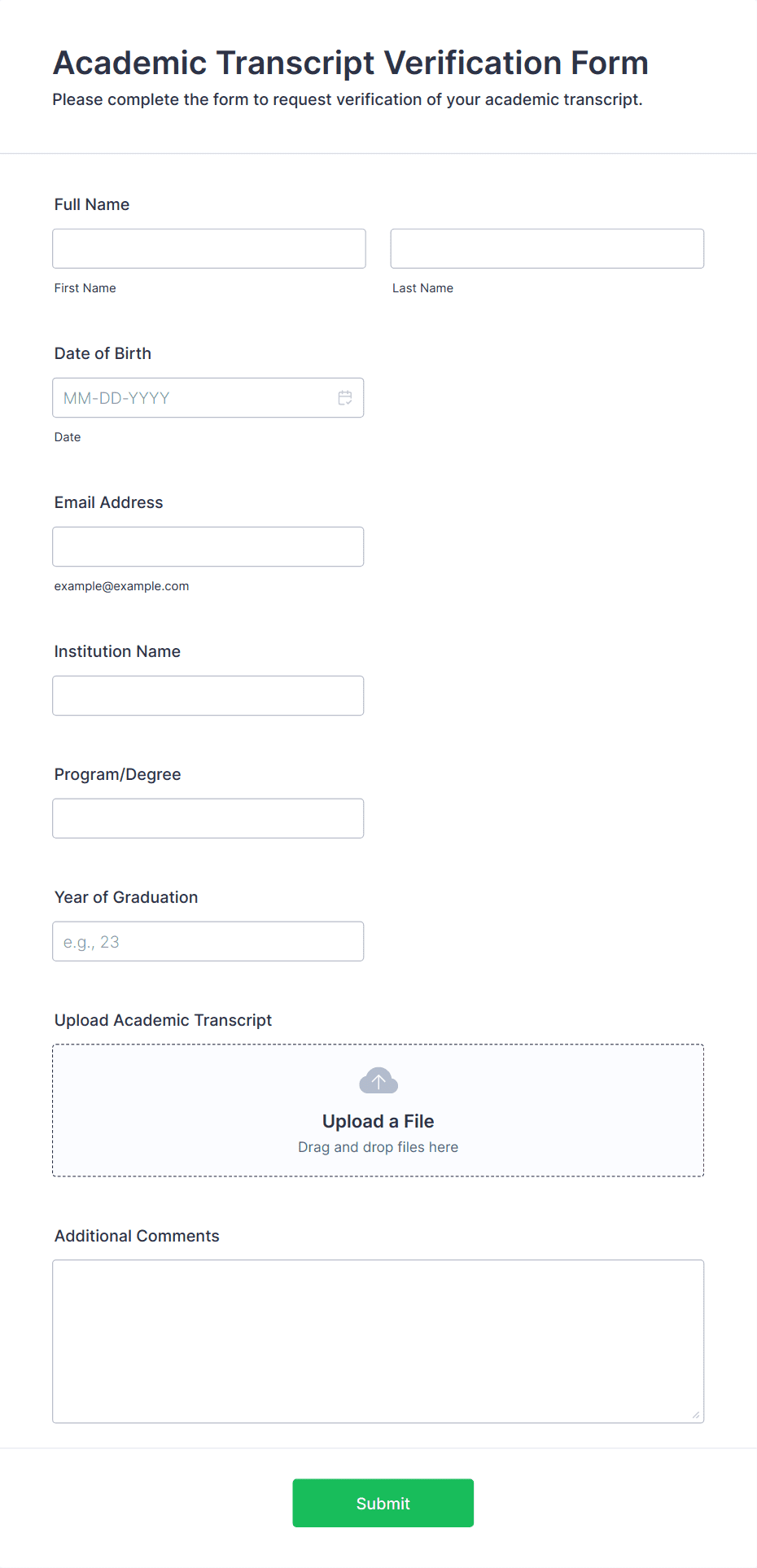 • Use dropdowns or multiple-choice fields to specify the type of verification (e.g., identity, employment, address).