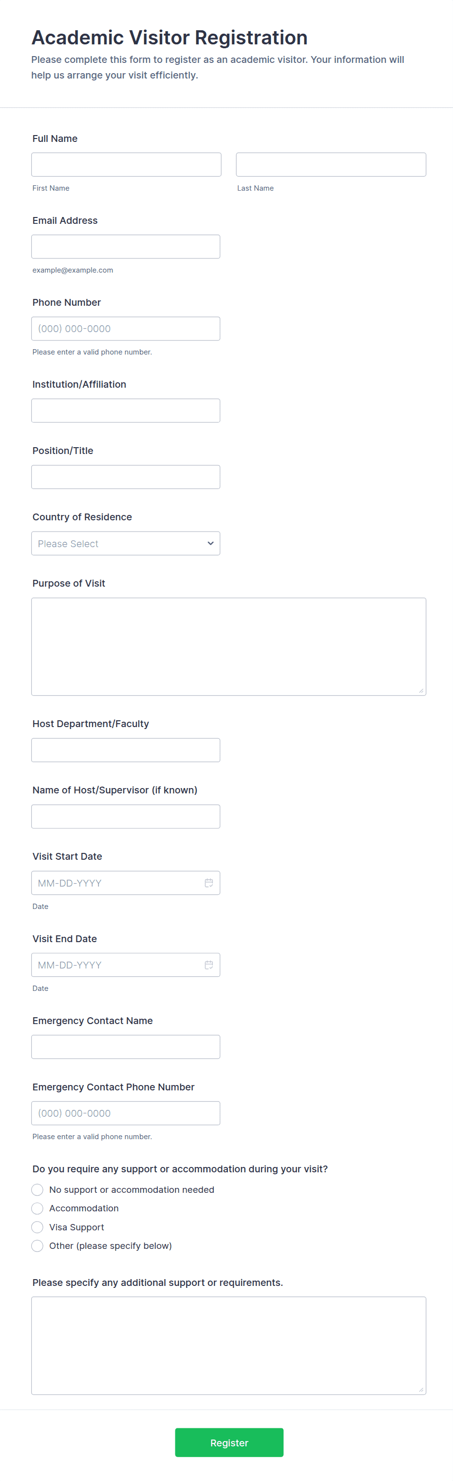 Common fields include name, email, phone number, date of visit or attendance, special requests, payment details (if applicable), and emergency contact information.