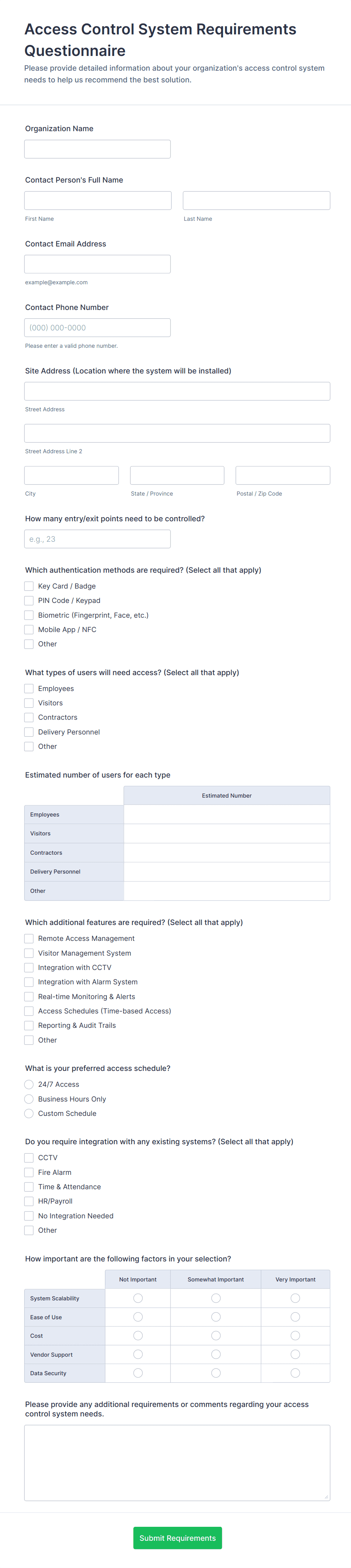 Collect requester name, department, contact info, and access type (physical, system, visitor). Include the reason for access and requested dates.