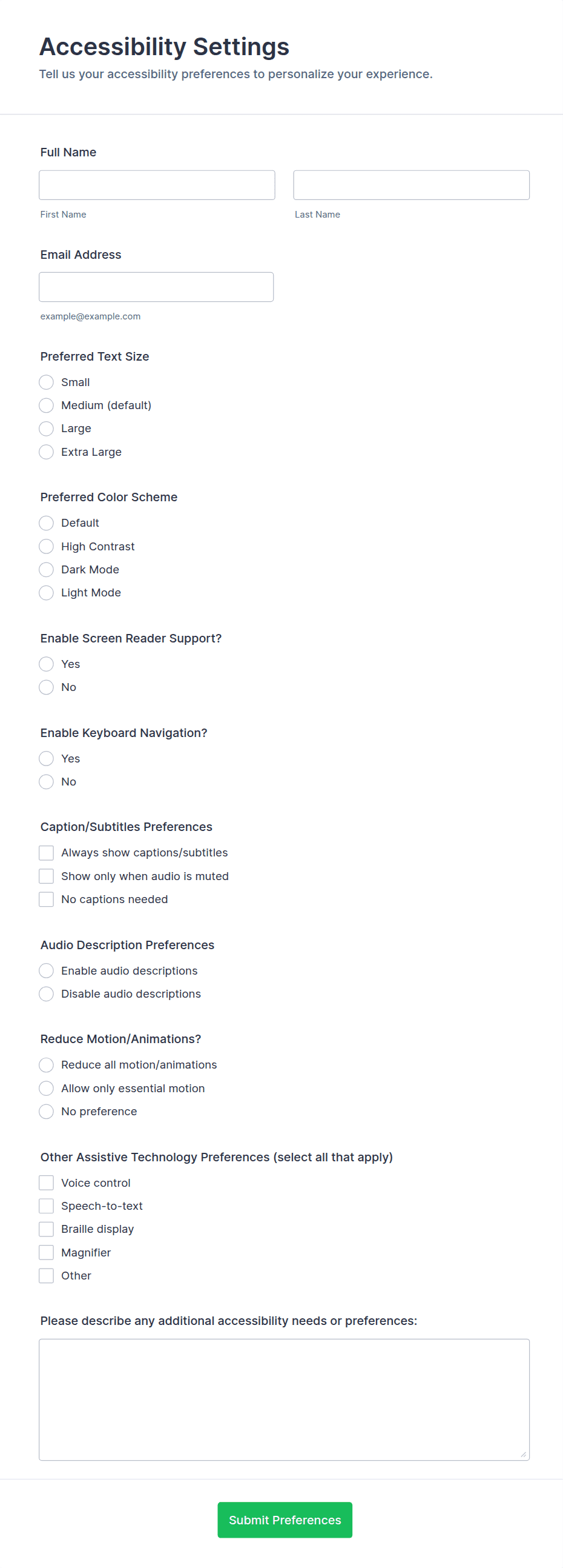 The form templates here are for informational purposes only. Jotform is not providing legal, financial, or other advice, or implying that the forms are legally valid in all or any jurisdictions. Before using any such form, consult an attorney and/or other applicable professionals to make sure that the form meets your needs, legally and otherwise.