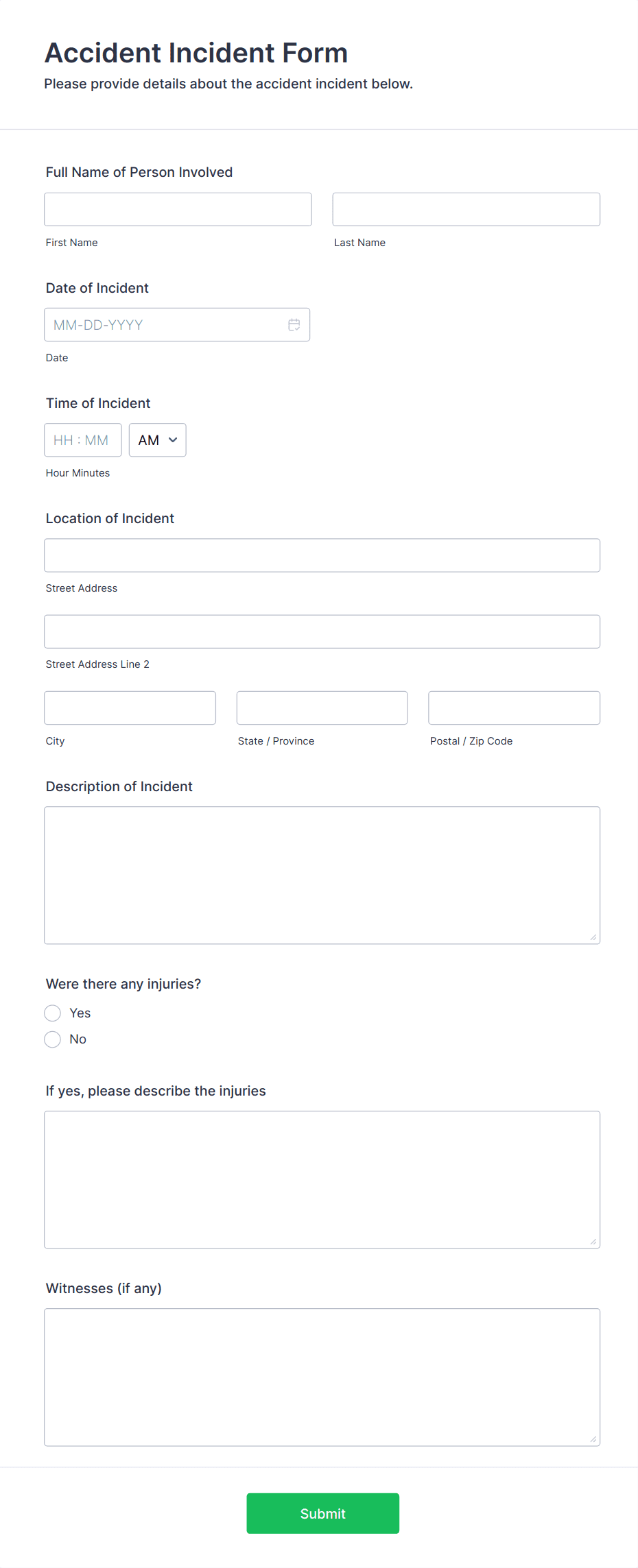 3. What information should be included in an incident report form?