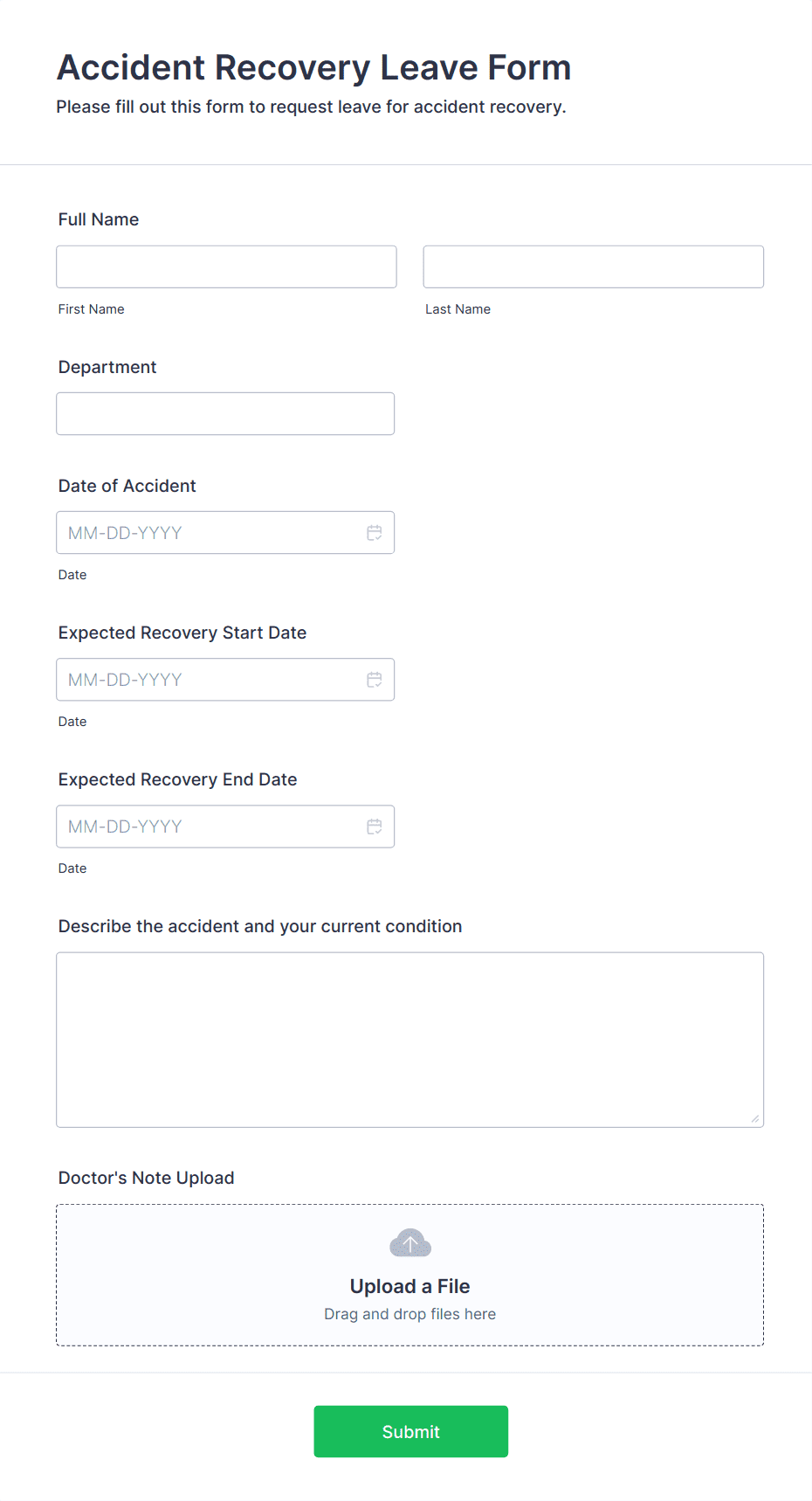 Common fields include employee name, department, type of leave, dates of absence, reason for leave, and any required supporting documentation.