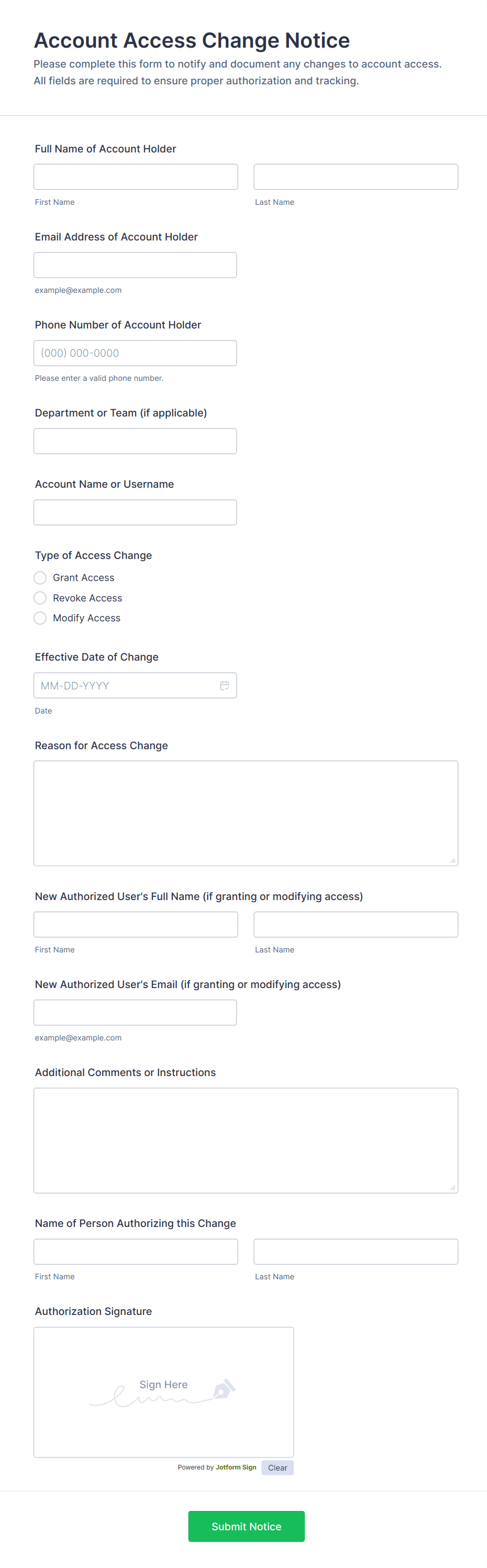 Access control forms are structured documents used to request, approve, and document access to physical locations, systems, or restricted resources. They help organizations manage who can enter certain areas, use specific equipment, or access sensitive digital systems by collecting consistent details such as requester identity, access level, justification, and approval records. Access control forms are commonly used in offices, campuses, data centers, hospitals, warehouses, and IT environments for badge requests, visitor access, temporary passes, role-based system access, and permission changes. By standardizing access requests, these forms reduce security risks, improve accountability, and create clear audit trails.