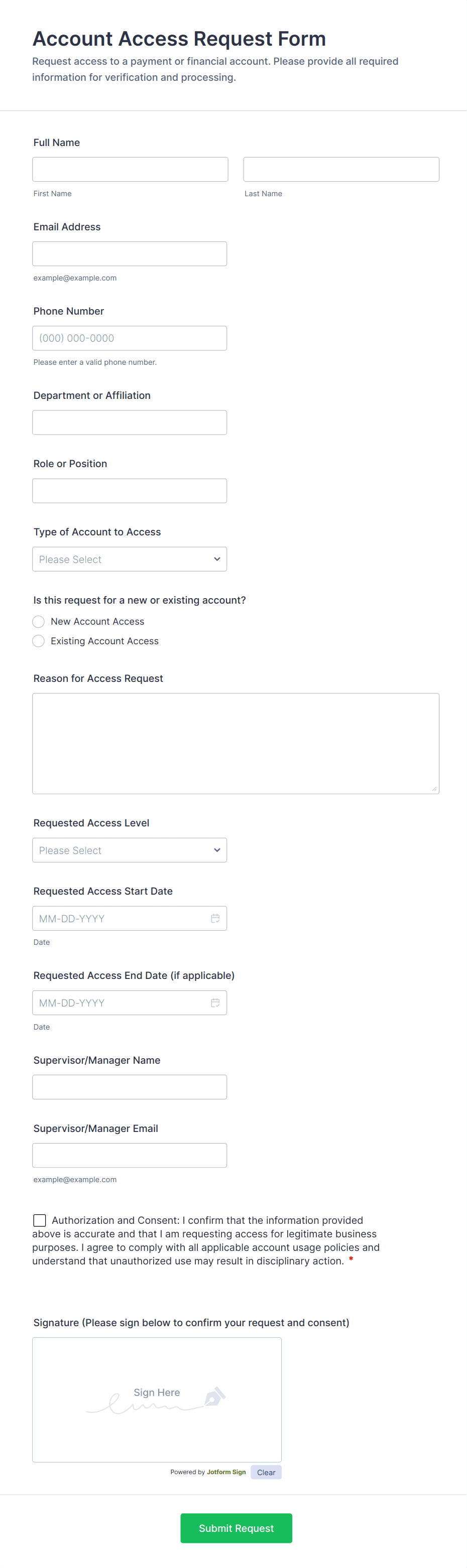 Collect and review employee access requests with the Authorized User Access Request Form, helping IT and managers approve system permissions, track time-bound access, and keep data collection organized in Jotform.