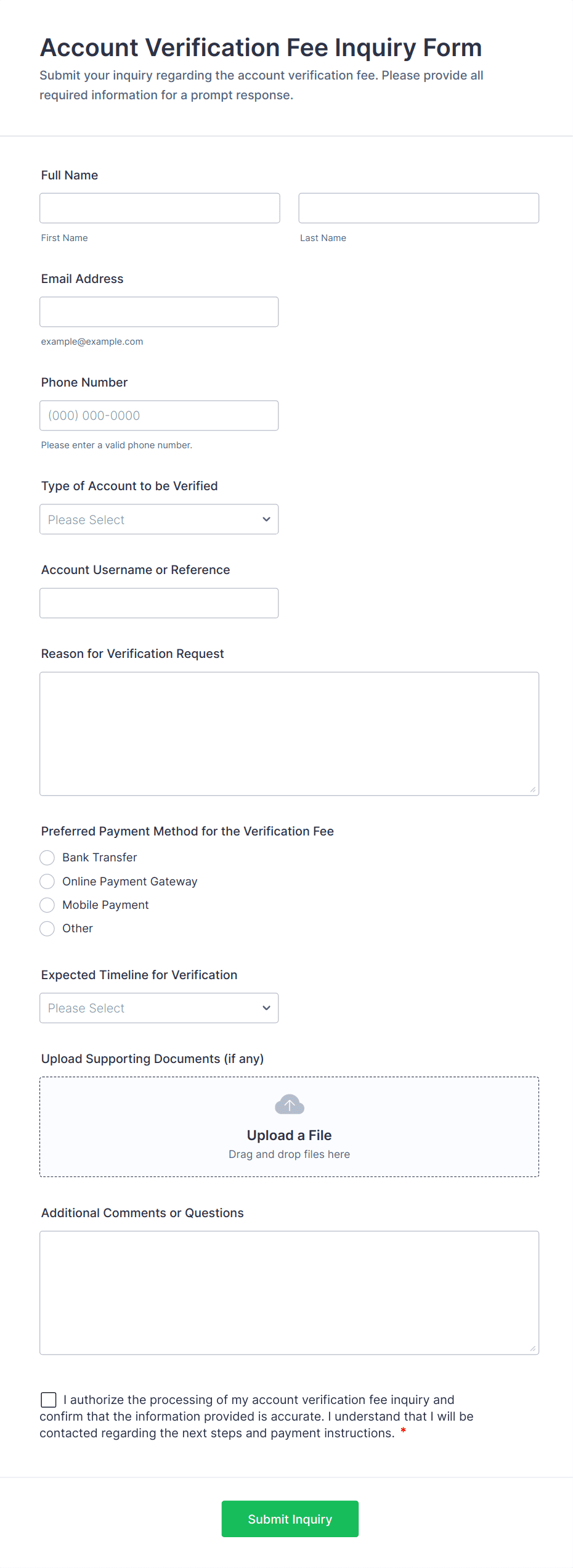 • Use dropdowns or multiple-choice fields to specify the type of verification (e.g., identity, employment, address).