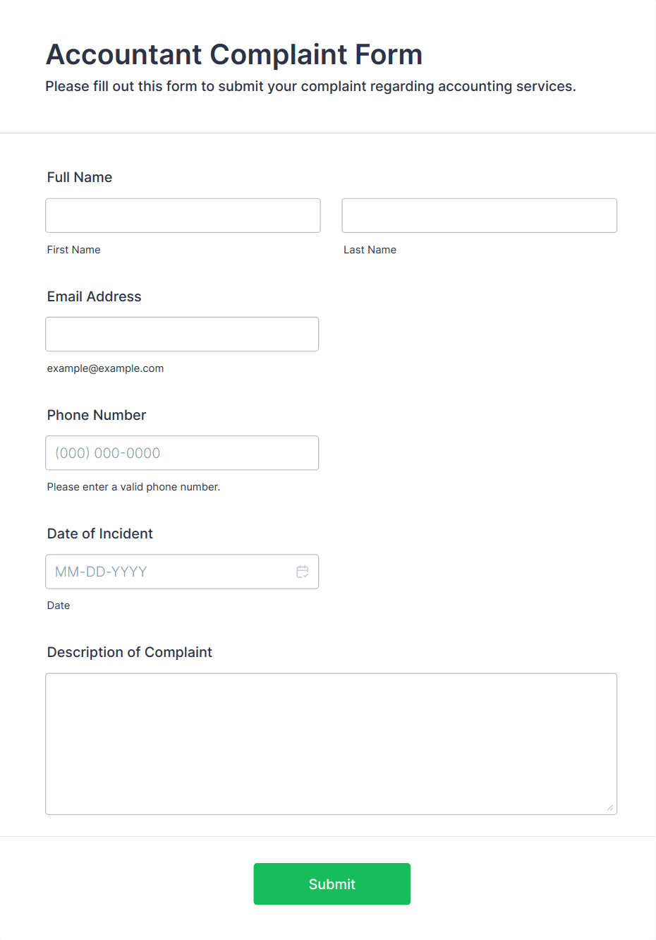 • Use conditional logic to show or hide fields based on user responses (e.g., display additional questions if the complaint is about a specific service).