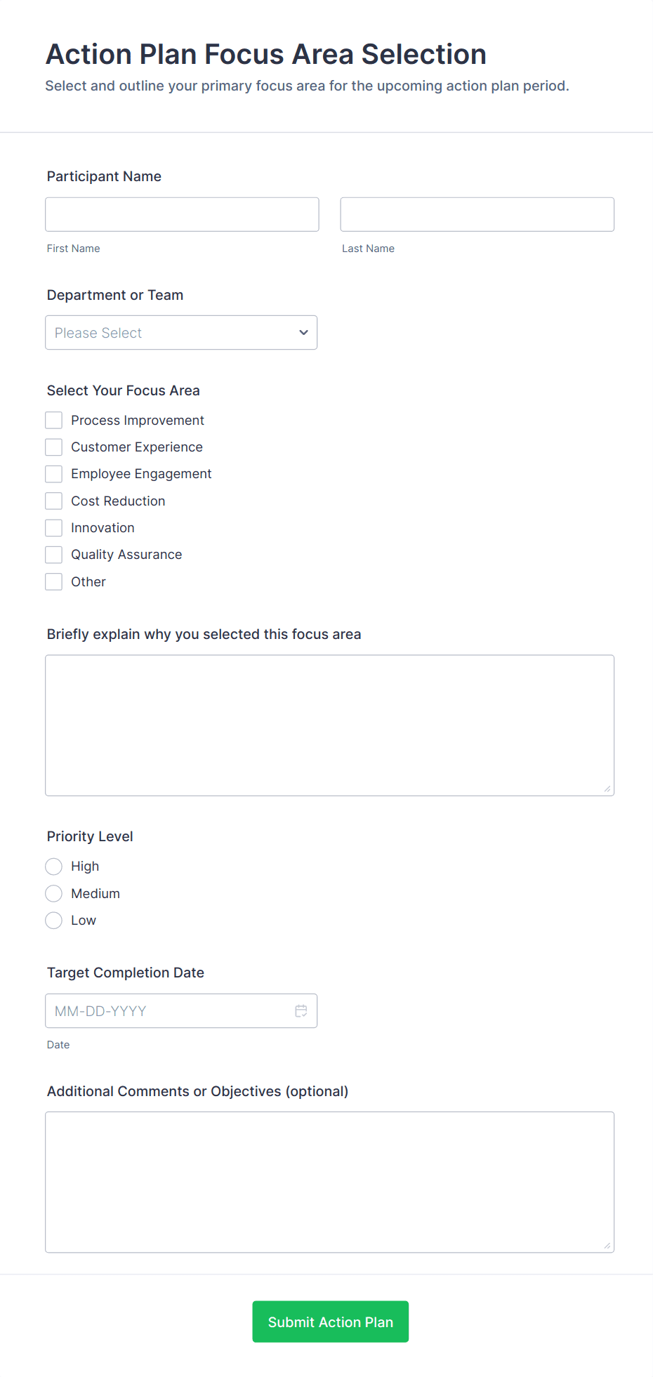 Include fields for requester name, department, request summary, impact, priority, cost or resource needs, and any supporting attachments. For reporting forms, include KPIs, progress notes, and blocker fields.