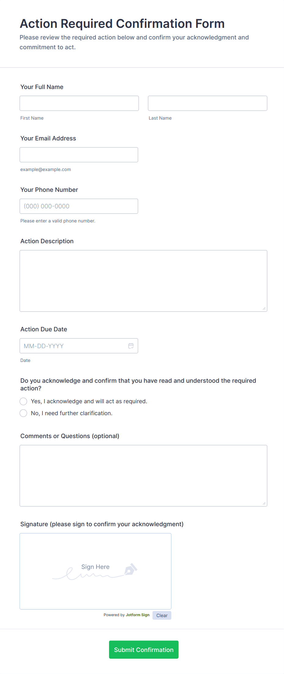 Confirmation Form Templates are specialized online forms designed to capture and verify user consent, agreement, or acknowledgment for a wide range of scenarios. These templates are commonly used to confirm event attendance, order details, appointment bookings, policy acceptance, or receipt of information. By providing a structured way for users to confirm their participation or understanding, these forms help organizations ensure clarity, reduce misunderstandings, and maintain accurate records. Whether you’re managing RSVPs for an event, confirming service appointments, or collecting digital signatures for policy agreements, confirmation forms streamline the process and provide a clear audit trail.