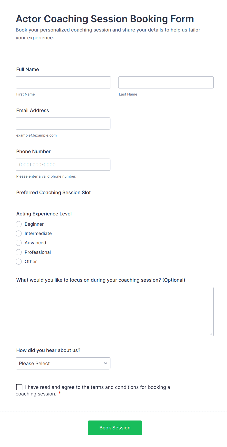 An acting application form is used to collect information about those interested in acting as extras or appearing in commercials, TV shows, or movies. Customize this template without coding!