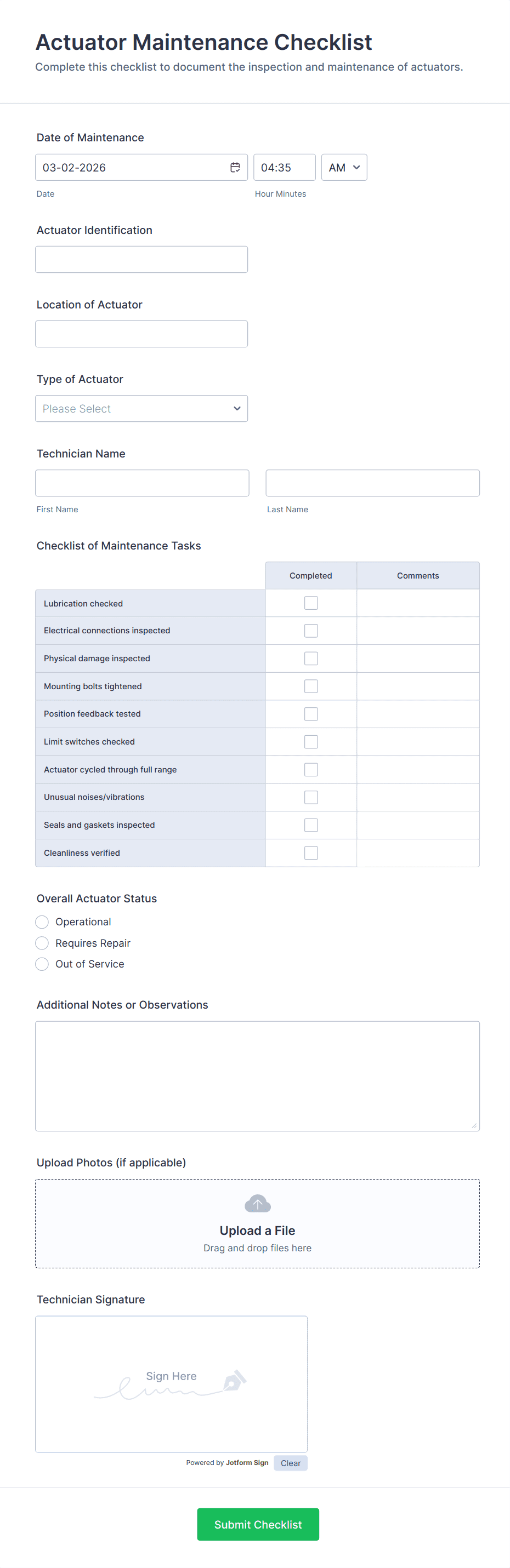 Track weekly inspections and maintenance activity with the Weekly Equipment Maintenance Checklist Form in Jotform, helping facilities and operations teams standardize data collection and keep equipment records organized.