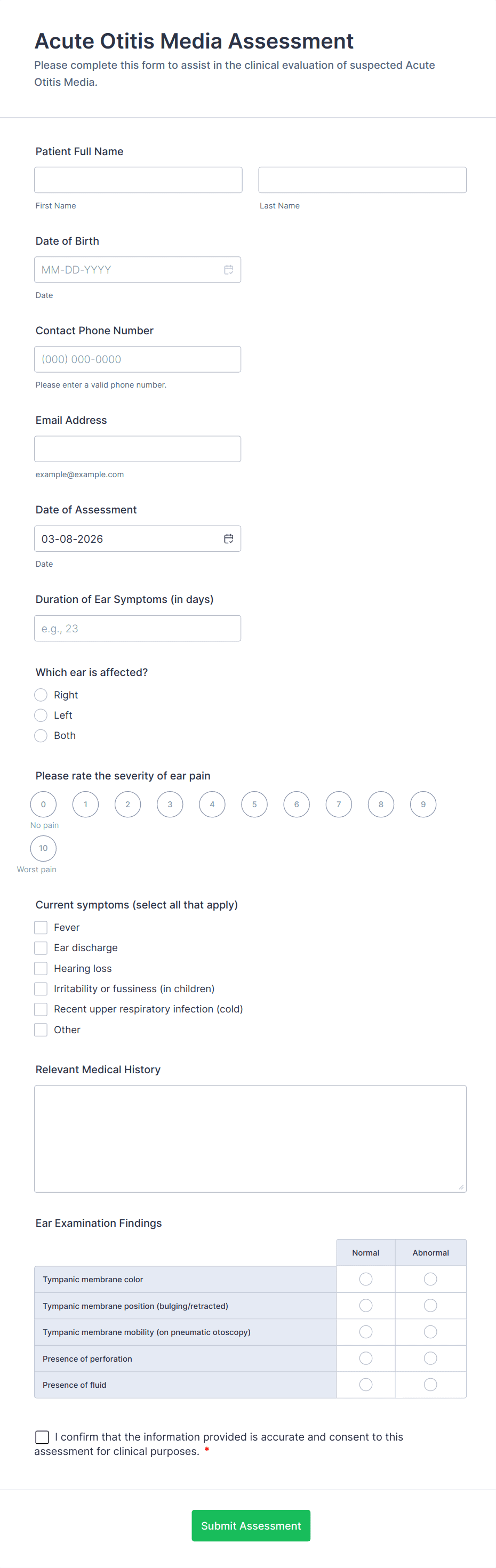 Collect patient name, contact details, appointment type, and reason for assessment. Use dropdowns for clinic department or visit type.