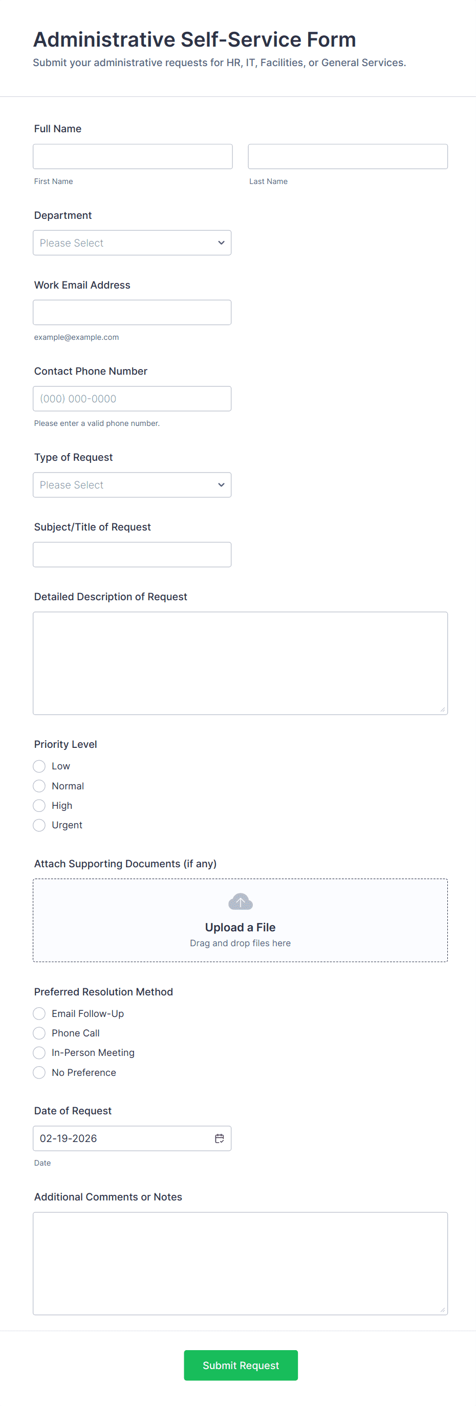 Administrative forms are documents that educational institutions use to record and manage information related to students, staff, and daily operations. With powerful online forms from Jotform, you can fast-track administrative tasks and streamline your recordkeeping process with ease. Create custom online applications, enrollment forms, course evaluations, and more. Just select one of the free Administrative Form templates, update it to match your organization’s branding, then share the link or embed it in your website to seamlessly collect submissions from any desktop or mobile device.