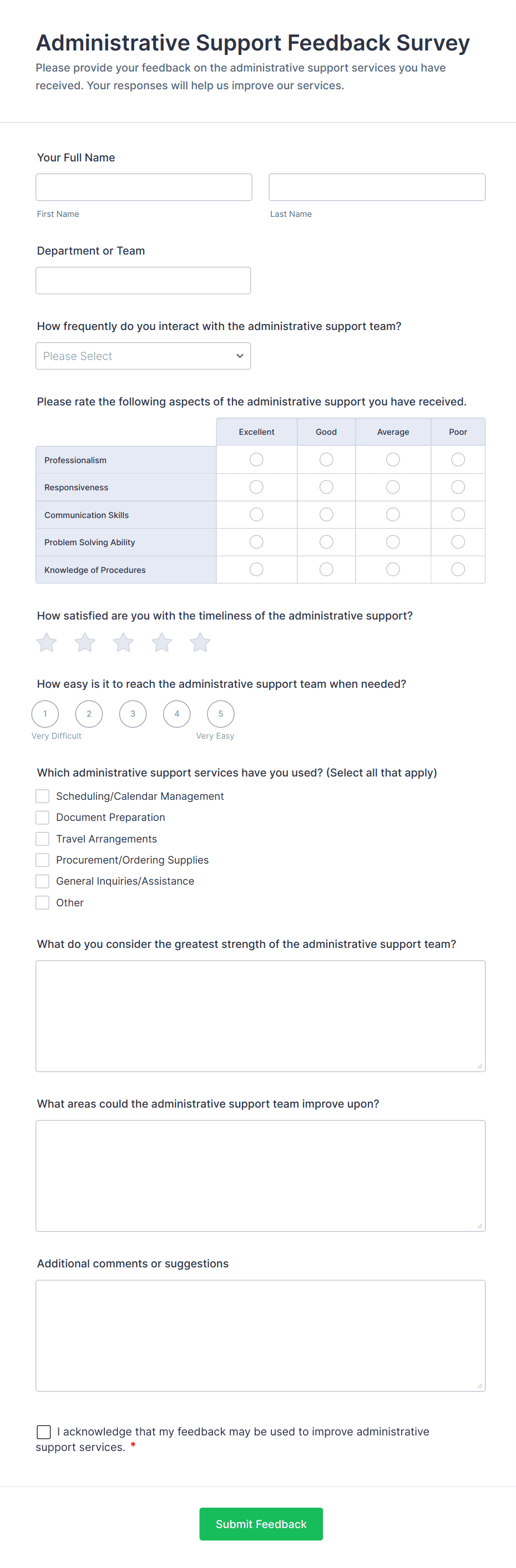• For customer feedback, include questions about satisfaction, product quality, and likelihood to recommend.