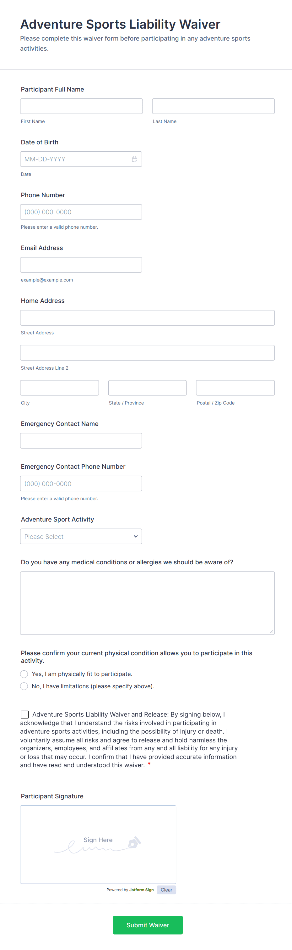Activity and sports waiver forms are structured documents used to collect participant acknowledgments and consent before joining physical activities, sports programs, or events. They help organizers communicate risks, confirm participant understanding, and document agreement to liability terms, safety rules, and participation requirements. Activity and sports waiver forms are commonly used by gyms, sports clubs, schools, camps, event organizers, trainers, and recreational facilities for leagues, classes, tournaments, fitness sessions, and outdoor activities. These forms often include participant details, emergency contact information, medical considerations, and required signatures. By standardizing waivers, organizations reduce administrative friction, improve safety communication, and keep participation records organized.