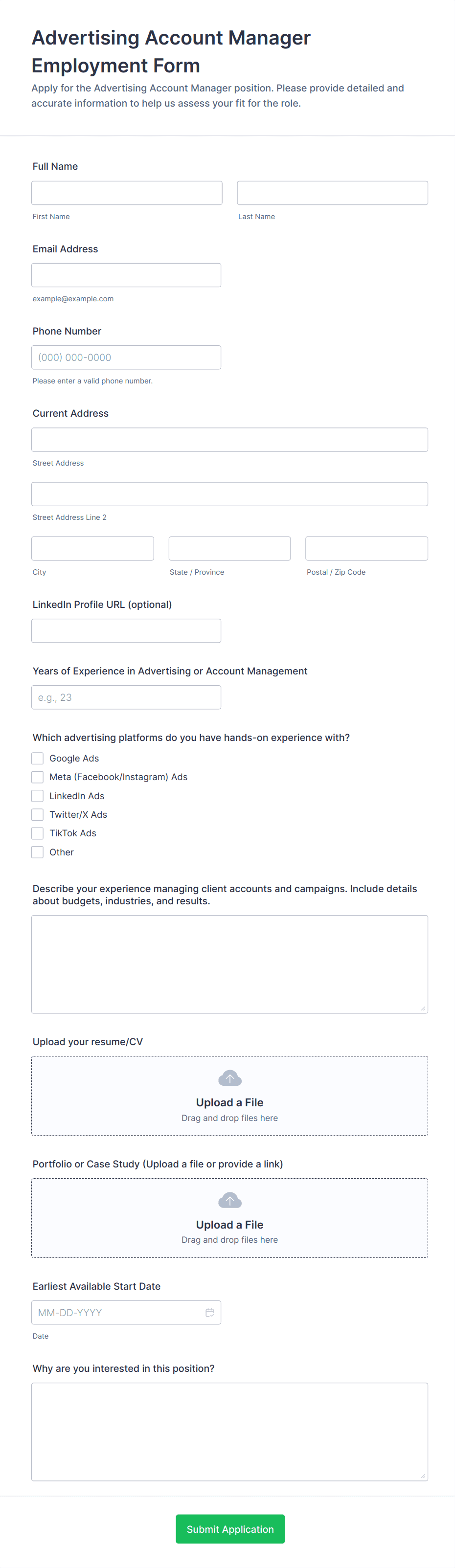 An Employment Application Form is a form template designed to streamline the hiring process by collecting essential information from prospective employees.
